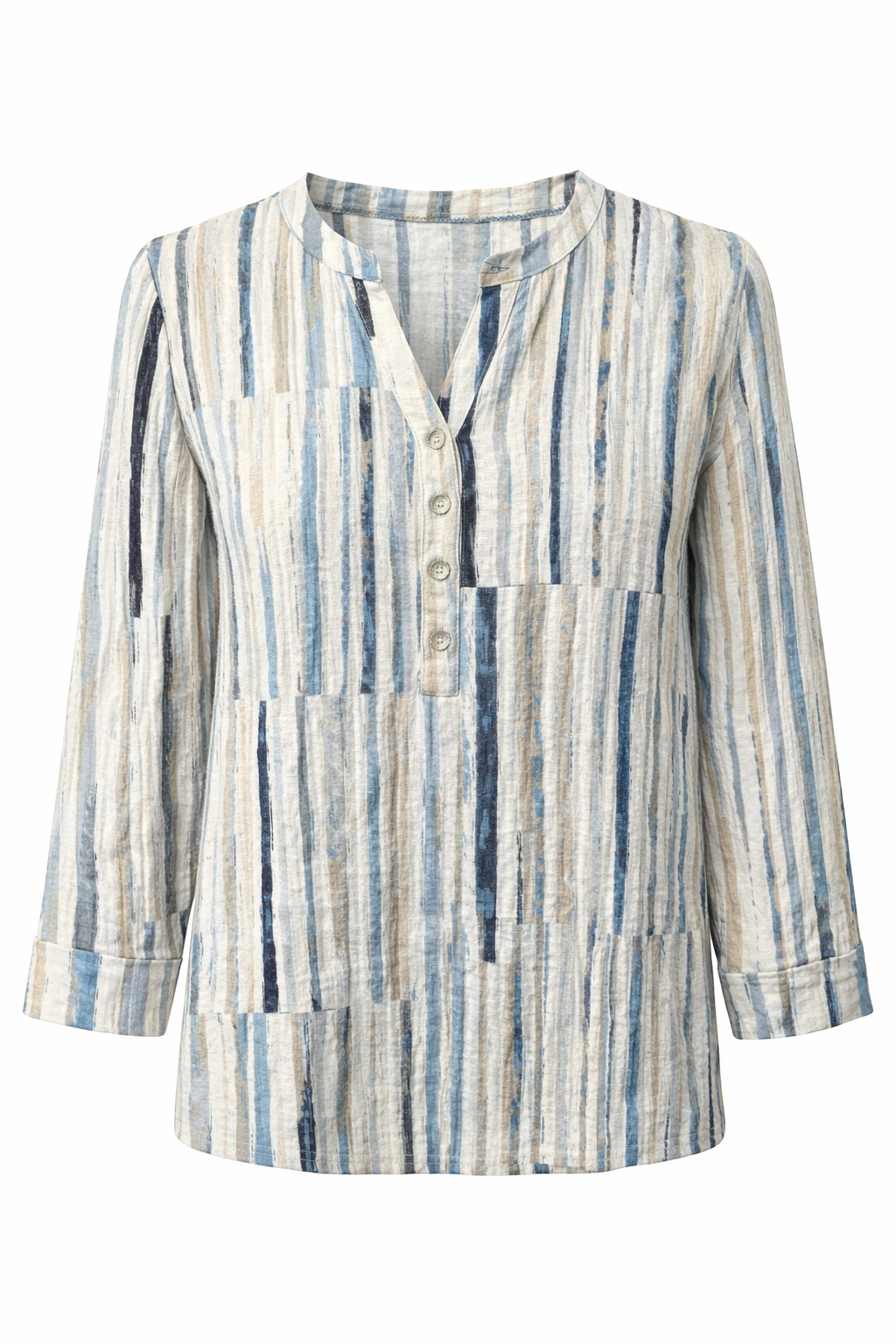 Super sød bluse fra 2-Biz i Amoa modellen med blå striber. Den har kinakrave med v-udskæring og stolpelukning. Den har 7/8 ærmer og normal pasform og længde. Style den evt med en denim buks. Kvalitet: 78% viskose / 22% polyamide