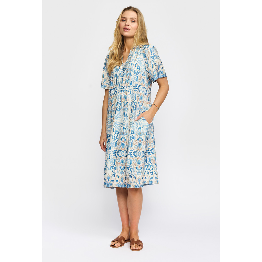 Smukkeste kjole fra 2-biz i blålig print. Kjole med V-hals og knaplukning på stolpe. Designet med korte ærmer og rynkede detaljer i taljen både foran og bagpå for en flatterende silhuet. Den har lommer i siden samt går lige til under knæene. Styles med en sød jakke og sandal evt. Kvalitet: 100% viskose