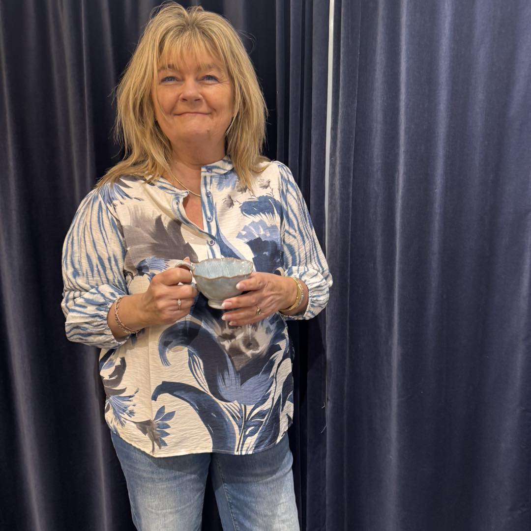 Smuk bluse fra 2-Biz i blå. Bluse med trekvartærmer med elastik og stolpelukning med knapper. Blusen har to forskellige prints. Style den evt med en blå buks. Kvalitet: 90% viskose og 10% nylon