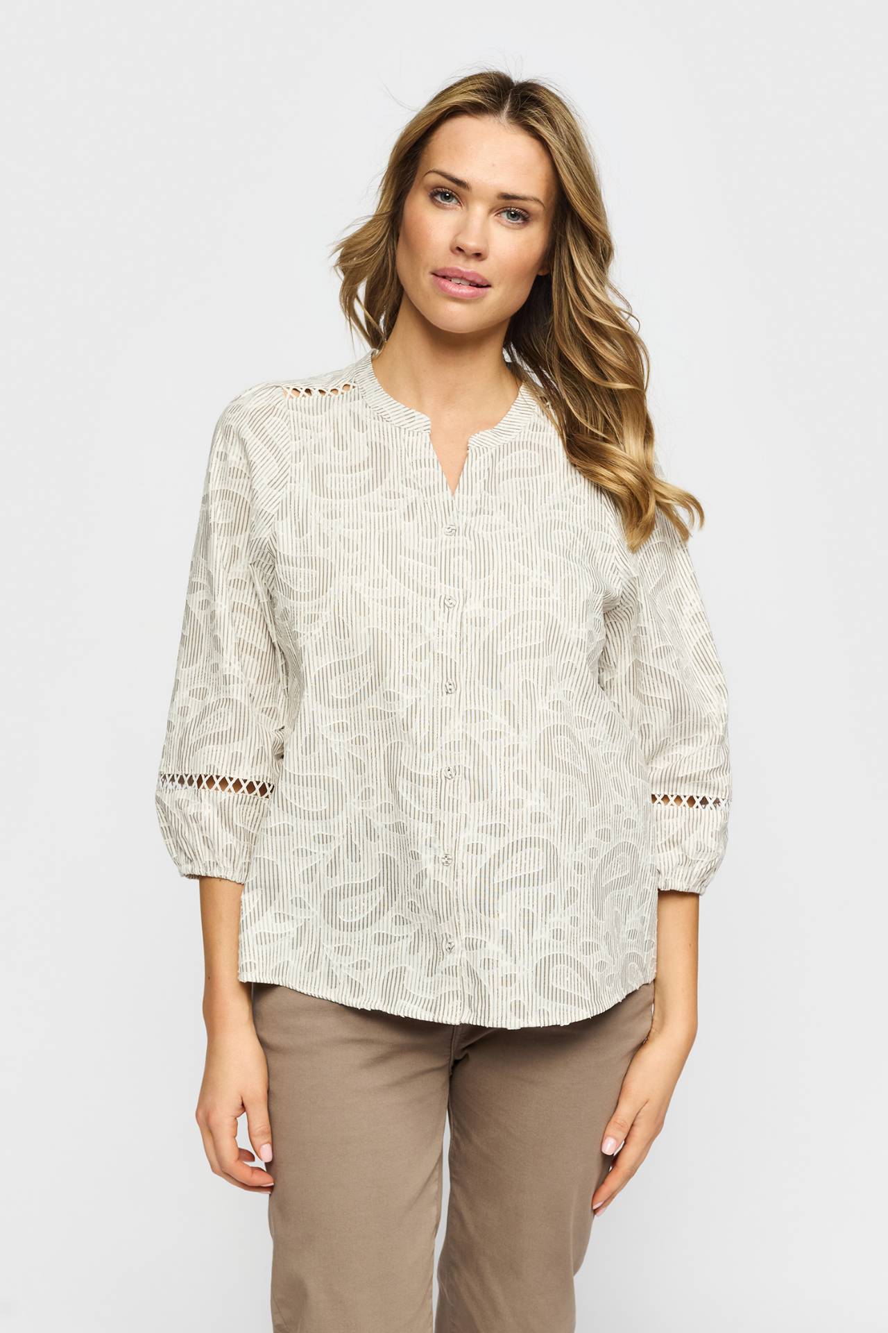 Super sød bluse fra 2-Biz i brunlige og hvide striber. Den har kinakrave med v-udskæring og lange æmer. Den er gennemknappet og flot blomster print. Normal i pasform og længde. Kvalitet: 52% Cotton / 48% Polyester