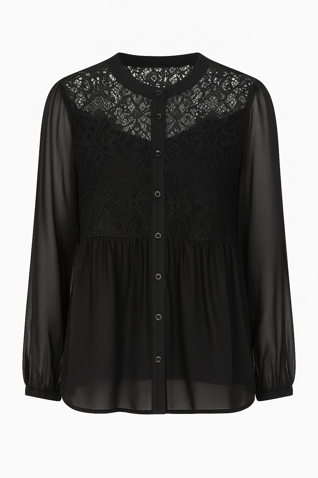 Smuk sort bluse fra 2-Biz med blonde. Er gennemknappet og har overskæring på midten, Materiale: 70% viskose og 30% silke. Vask: 30 grader.