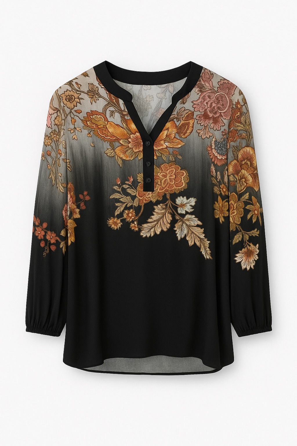 Smuk sort bluse fra 2-Biz med orange og rosa blomster. Har knapper øverst og 3/4 ærmer med elastikkant. Materiale: 100% viskose. Vask: 30 grader.