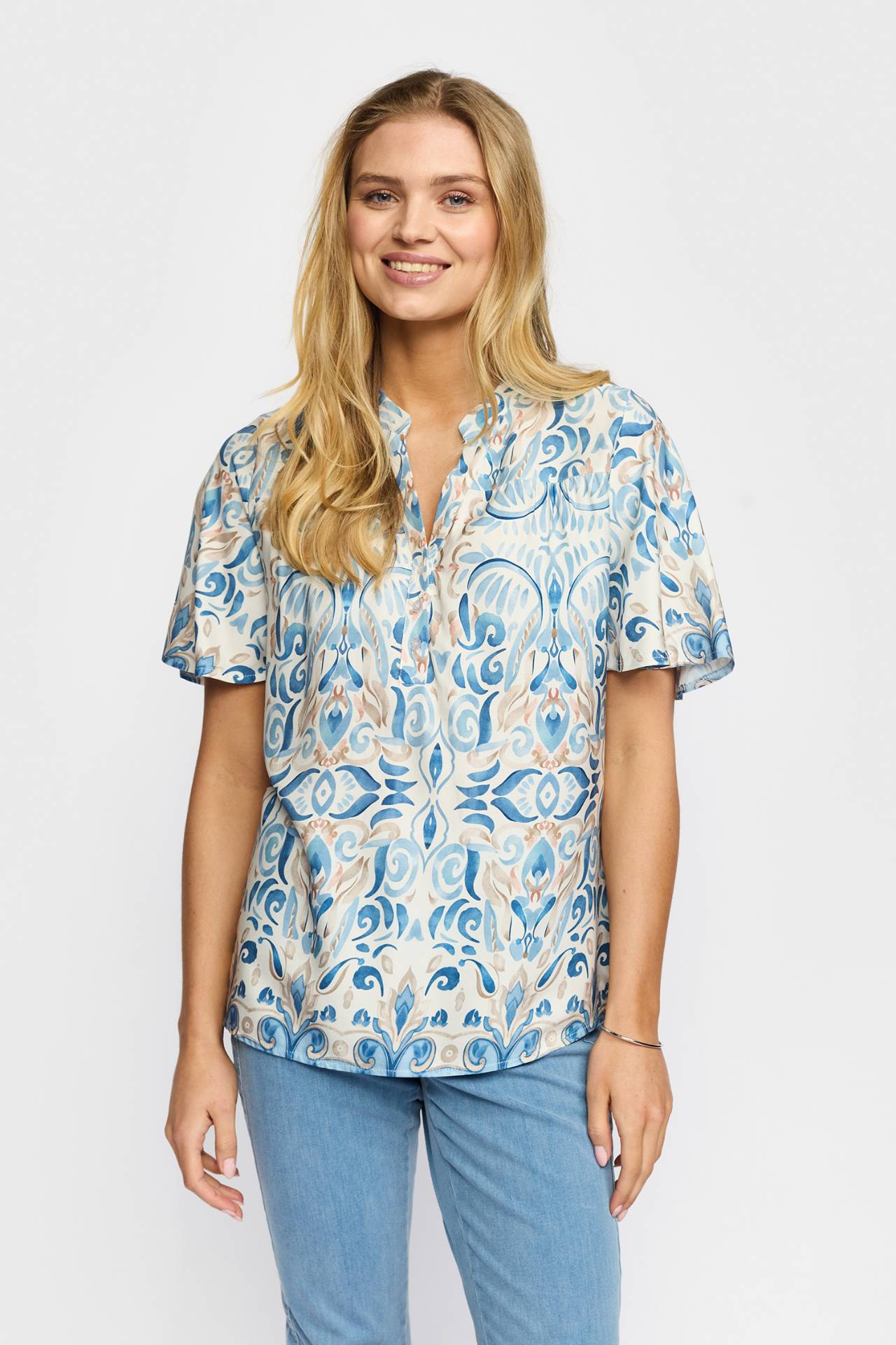 Super sød bluse fra 2-Biz i blå print. Den har kinakrave med v-udskæring og stolpelukning. Den har korte ærmer og normal pasform og længde. Styles evt med en blå eller sand underdel. Kvalitet: 100% viskose