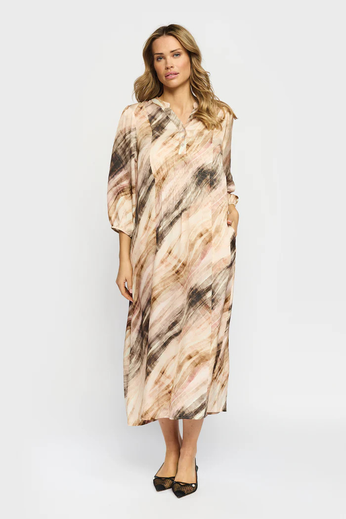 Super smuk kjole fra 2-biz i flot sand print. Den har kinakrave med v-udskæring og stolpelukning. Lang kjole med 3/4-ærmer og smockdetalje foran i taljen. Kvalitet: 70% viskose og 30% silke