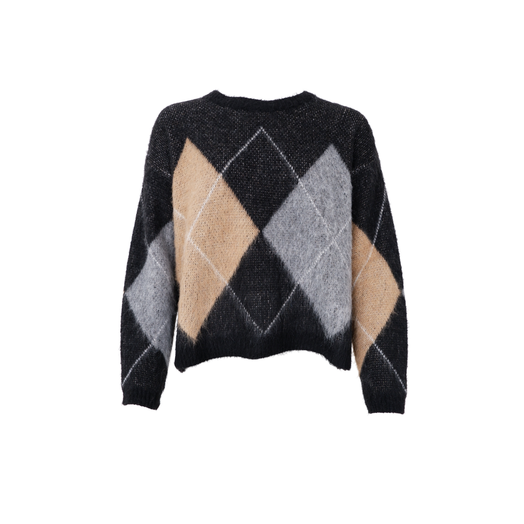 Lækker sort strik fra Black Colour med sandfarvet og gråt mønster. Har rund hals og ribkant forneden. Materiale: 57% akryl, 29% polyamid, 7% uld og 7% viskose. Vask: 30 grader.