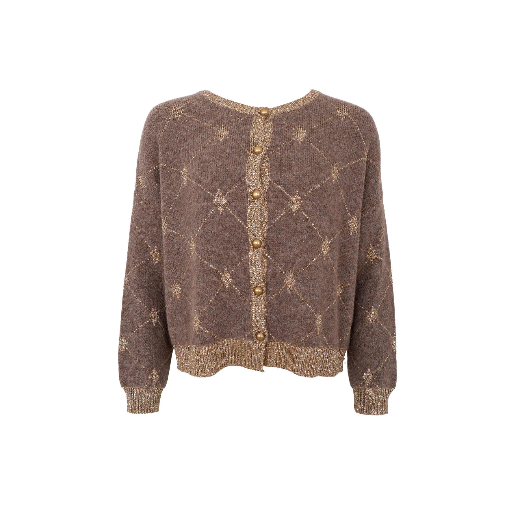 Festlig lysebrun cardigan fra Black Colour med guld og glitter. Har knapper i guld samt mønster og ribkant i guld. Materiale: 39% akryl, 30% viskose, 20% polyamid, 6% fiber og 5% uld. Vask: 30 grader.