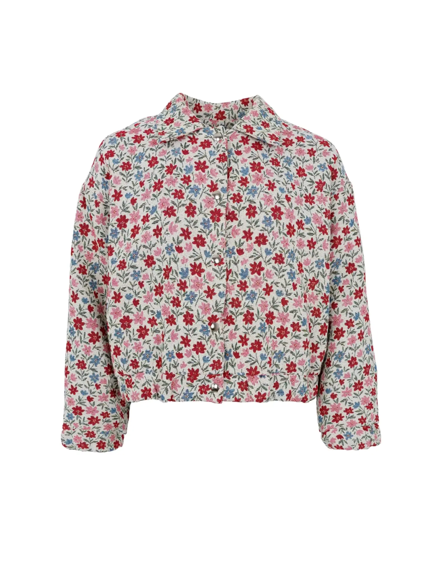 Jakke fra Black Colour i blomsterprint. Fin jakke fra Black Colour med et farverigt blomsterprint, der giver et feminint og livligt udtryk. Jakken har en kort pasform, klassisk krave og knaplukning foran, som tilfører et let og stilrent look. Perfekt som et statement-piece til både hverdag og fest style den med jeans eller over en kjole for et personligt outfit. Mål S/M: ½ Bryst: 60 cm. Længde: 56 cm. Materiale: 62% Polyester, 32% Cotton, 6% Other fibers - Lining: 100%
