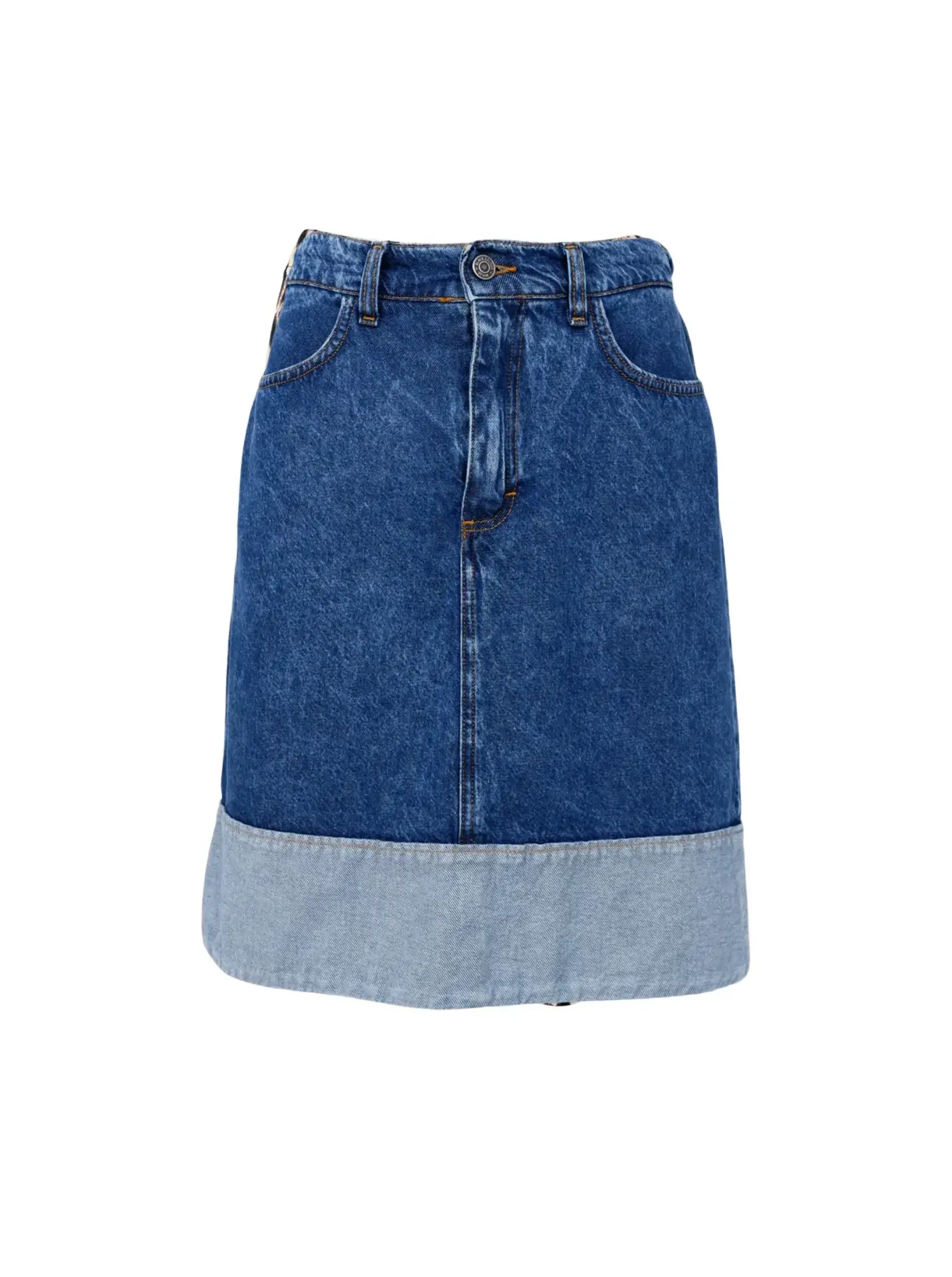 Izzy nederdel er en kort nederdel udført i denim og har et enkelt, lige snit. Det brede kontrastpanel nederst tilfører designet et markant visuelt element og giver nederdelen et moderne udtryk. Elastik i den bagerste linning sikrer en behagelig pasform og øger komforten i brug. En anvendelig denimnederdel, der let kan styles med både skjorter, strik og T-shirts og fungerer godt til både hverdag og mere afslappede outfits. Kvalitet: 100% Bomuld S/M: ½ talje (afslappet): 35 cm. ½ talje (udstrakt): 42,5 cm. Længde: 50 cm
