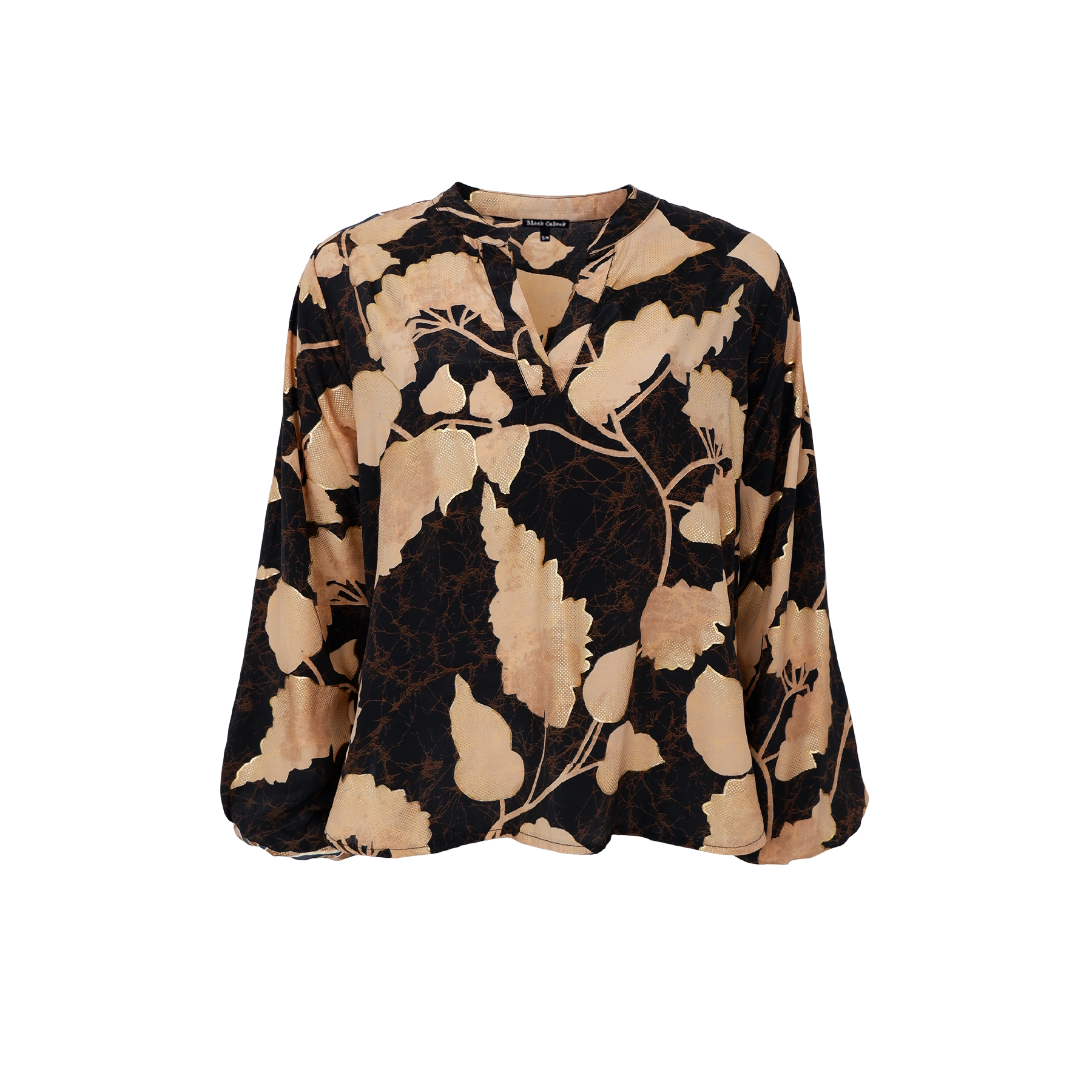 Smuk sort og sandfarvet bluse fra Black Colour med gulddetaljer i mønsteret. Har v-udskæring og elastikkant ved ærmet. Materiale: 100% polyester. Vask: 30 grader.