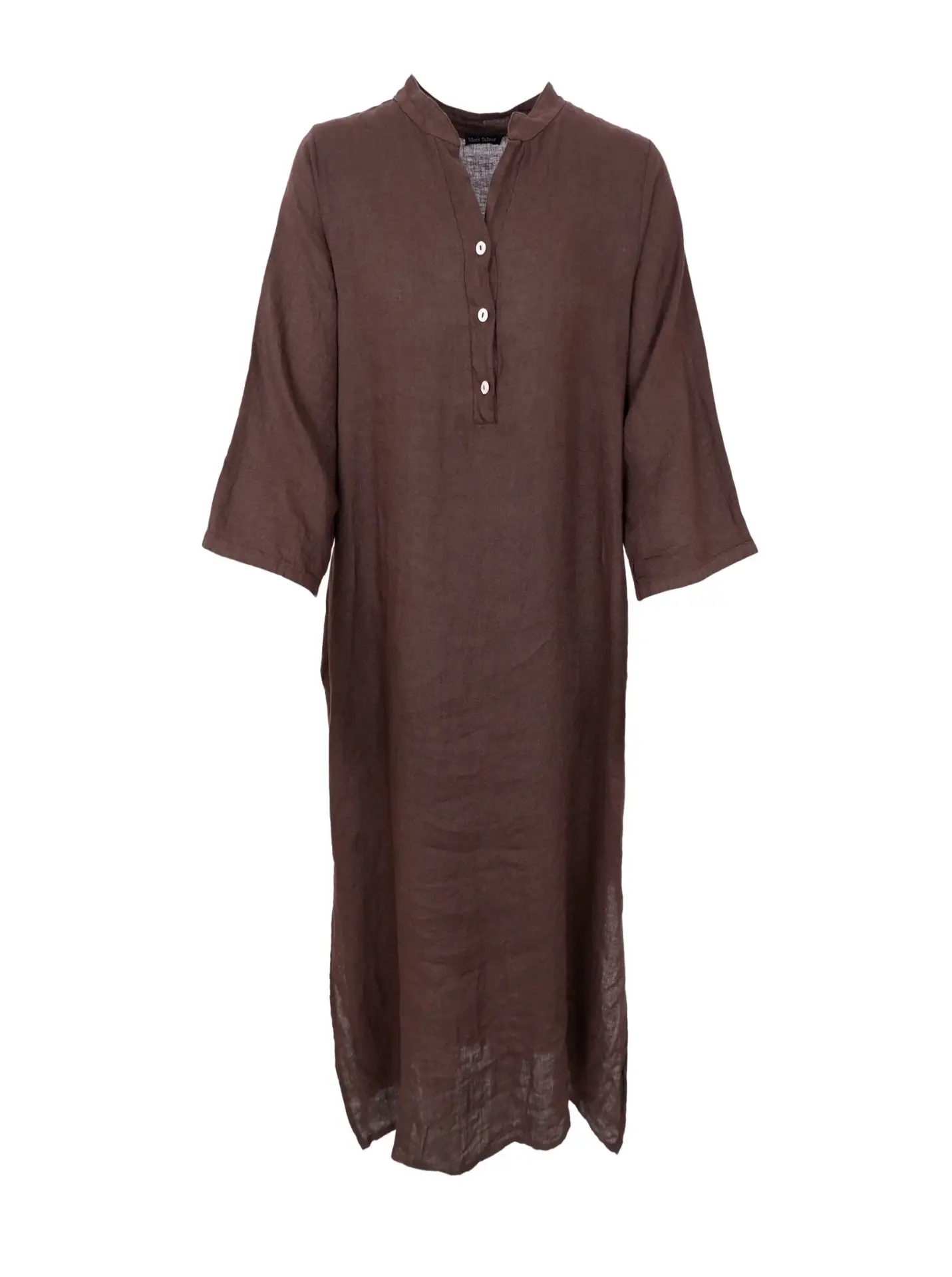 Let og afslappet kjole i et enkelt og tidløst design. Den løse pasform kombineret med det bløde fald giver et ubesværet og komfortabelt look - perfekt til både hverdag og feriestemning. Kjolen har en feminin V-udskæring med knaplukning og korte, løse ærmer, der understreger det afslappede udtryk. Det lette materiale gør den behagelig at have på hele dagen. Kvalitet: 100% Hør S/M: ½ Bryst: 52 cm. Længde (foran): 118 cm. Længde (bagpå): 127 cm.