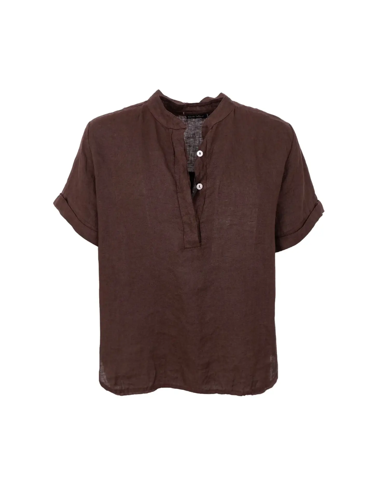Let og afslappet bluse i et enkelt og tidløst design. Den løse pasform og det lette hør materiale giver et ubesværet og komfortabelt look - perfekt til både hverdag og varme dage. Blusen har en feminin V-udskæring med knaplukning og korte ærmer med opsmøg, der understreger det afslappede udtryk. Den enkle silhuet gør den nem at style med både bukser og nederdele. VIGTIGT: Black Colour hørstyles er indfarvet i forskellige batches. Vi kan ikke garantere præcis samme farvetone fra style til style. Kvalitet: 100% Hør S/M: ½ Bryst: 56 cm. Længde (foran): 64 cm. Længde (bagpå): 68 cm.