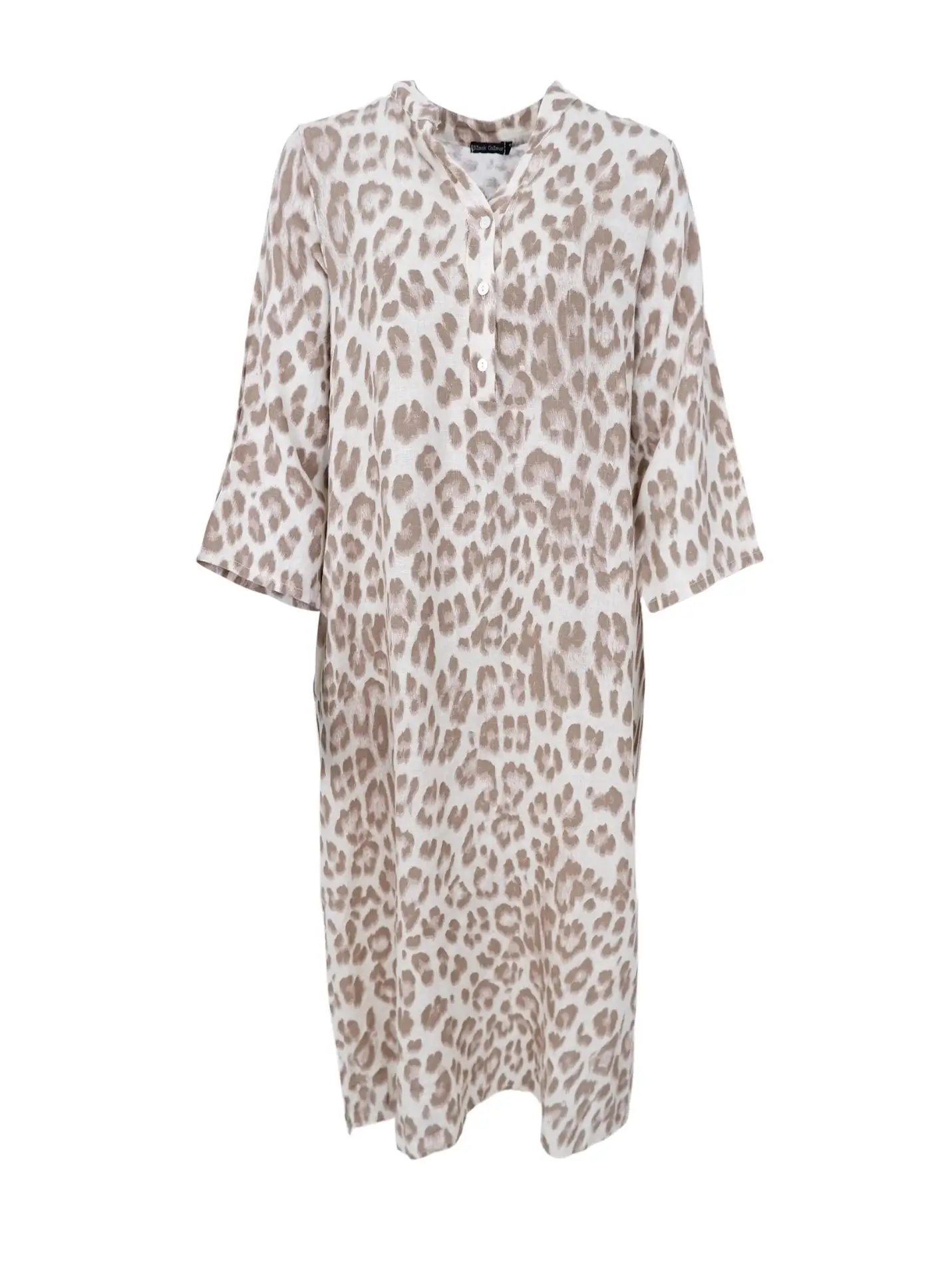 Let og afslappet kjole i et enkelt og tidløst design. Den løse pasform kombineret med det bløde fald giver et ubesværet og komfortabelt look - perfekt til både hverdag og feriestemning. Kjolen har en feminin V-udskæring med knaplukning og korte, løse ærmer, der understreger det afslappede udtryk. Det lette materiale gør den behagelig at have på hele dagen. Kvalitet: 100% Hør S/M: ½ Bryst: 52 cm. Længde (foran): 118 cm. Længde (bagpå): 127 cm.