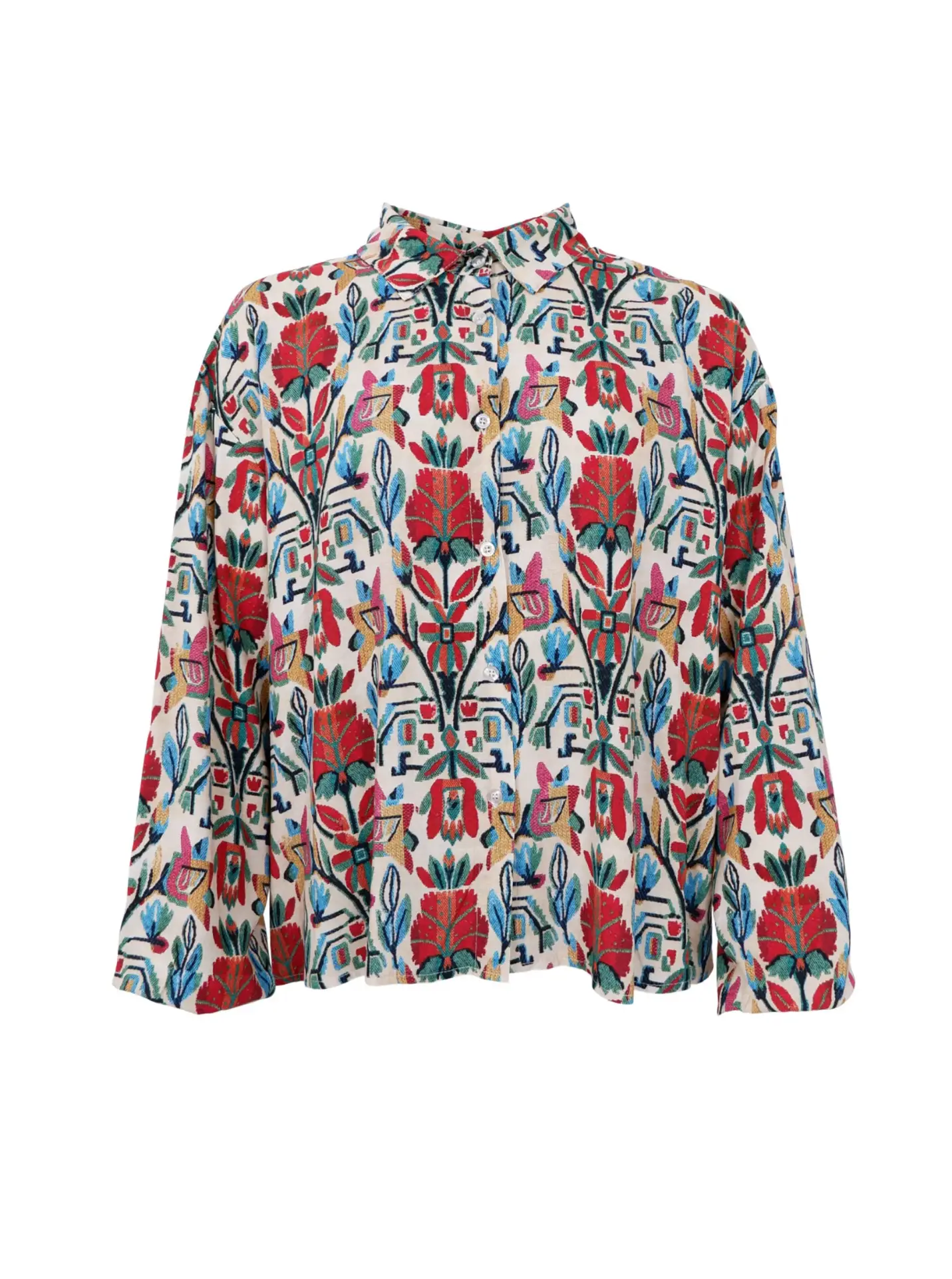 Vores Panama skjorte er en smuk skjorte udformet i et løst snit, der giver et afslappet fald og god bevægelse. Det gennemgående print tilfører skjorten karakter, mens den klassiske krave og knaplukning holder udtrykket rent og balanceret. Alt i alt en stilfuld skjorte, der fungerer både som statement-piece alene eller som del af et lag-på-lag look sammen med mere enkle styles. Kvalitet: 100% viskose S/M: ½ bryst: 61 cm. Længde (foran): 65 cm.