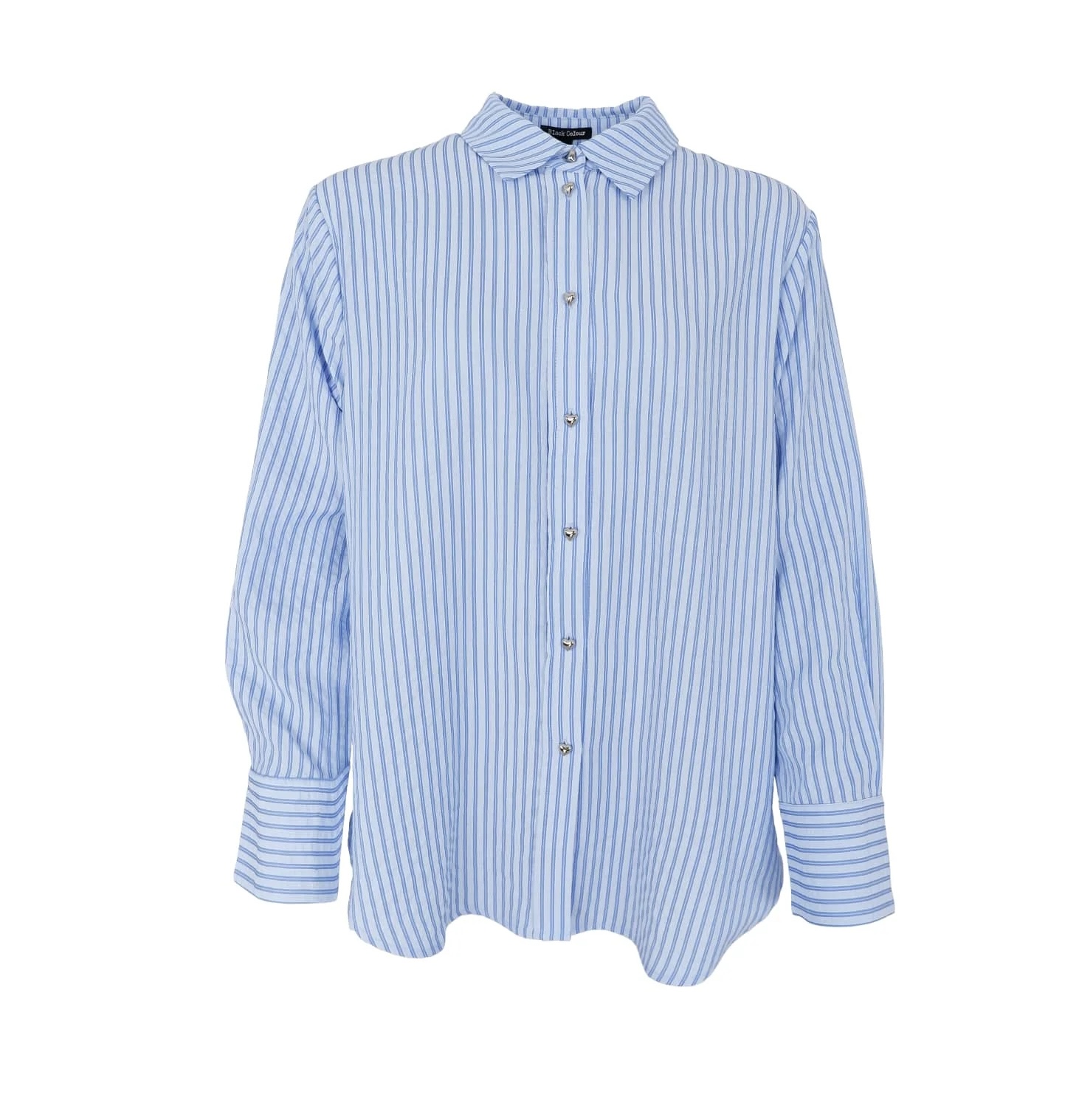 Klassisk og feminin oversized skjorte fra Black Colour med smalle, lodrette striber i lyseblå og hvid. Skjorten har en afslappet pasform, der giver et moderne og komfortabelt udtryk, og den er designet med fine hjerteformede knapper, som tilfører et elegant og legende twist. Den længere længde gør skjorten ideel både lukket som skjorte eller åben over en top som let overskjorte. Perfekt til både hverdag og mere afslappede, stilfulde outfits. Materiale: 50% Polyester, 40% Cotton, 10% Viscose Målt i en str. S/M Pasform Stor Fit Løs Fuld længde 78 cm Brystvidde 116 cm (+/- 4 cm) pr. størrelse