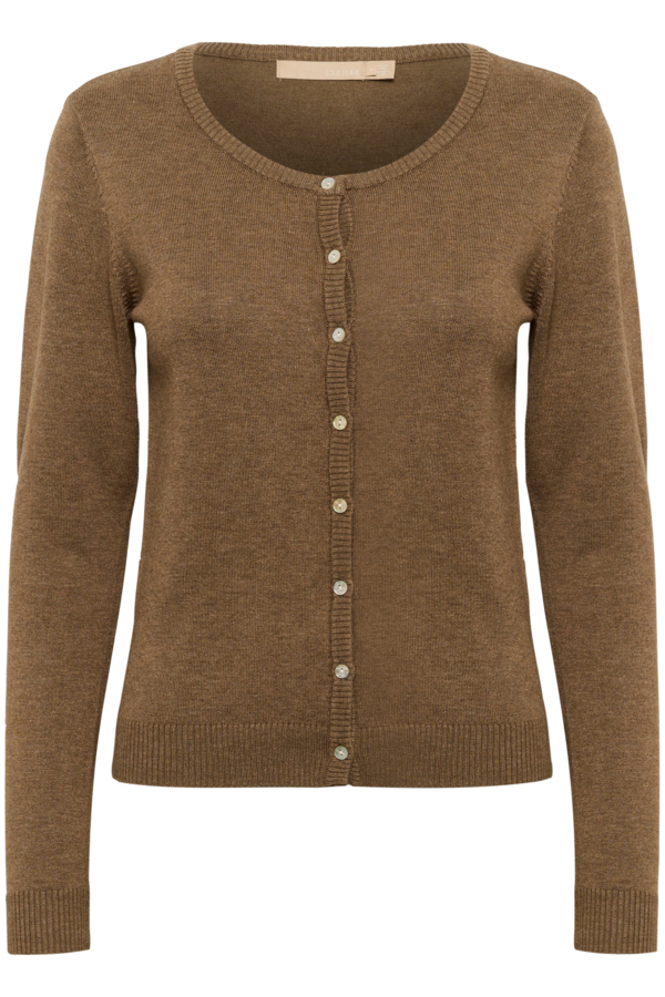 Lækker brun cardigan fra Culture. Er gennemknappet og har ribkant forneden. Materiale: 82% viskose og 18% elastan. Vask: 30 grader.