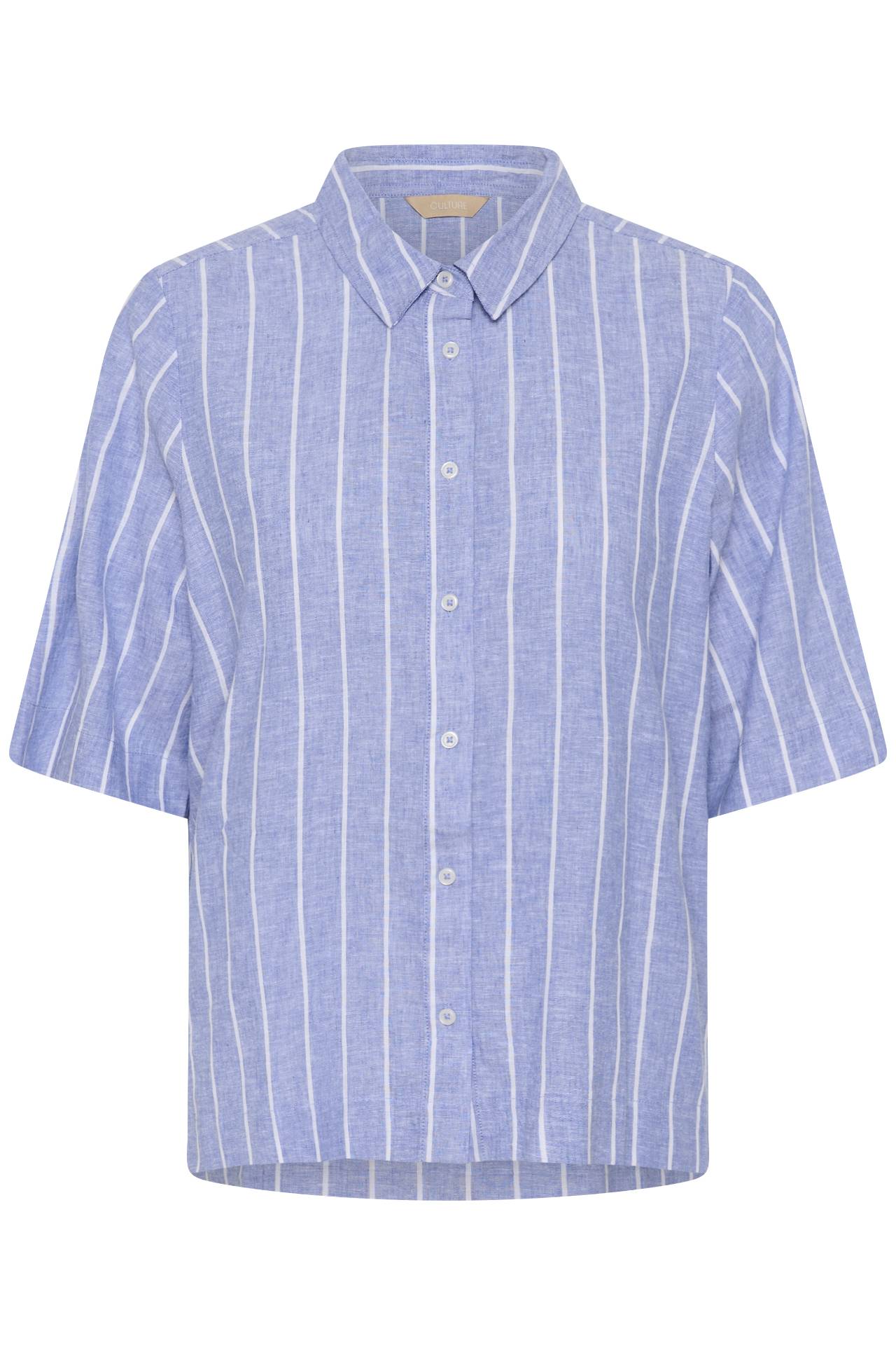 Super sød hørskjorte fra Culture i denim og hvide striber. Den har skjortekrave og er gennemknappet. Ærmerne går til albuerne og har en løs pasform. Styles med de matchende city shorts evt. Kvalitet: 52% Linen, 28% Cotton, 20% Cotton (Recycled)