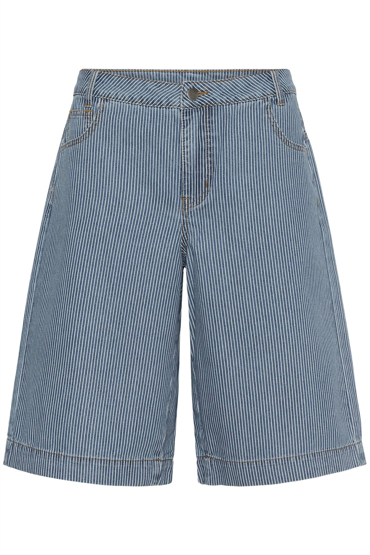 Fedeste city shorts fra Culture i denim og hvide striber. Linning: Med bælte Livhøjde: Normal Lukning, lås: Skjult lynlås Lommer: Baglommer, sidelommer Mønster: Stribet Detaljer: Bæltestropper Pasform Fit: Relaxed Design: Flared Længde: Knælang Indvendig benlængde: 33 cm i størrelsen 34 Materiale: 80% bomuld, 20% polyester For: 100% bomuld