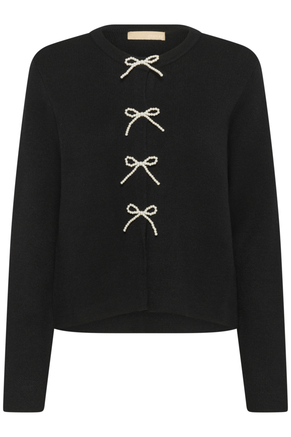 Festlig sort cardigan fran Culture med sløjfer i perler. Har rund hals og er kort i længden. Materiale: 52% viskose, 28% polyester og 20% polyamid. Vask: 30 grader.