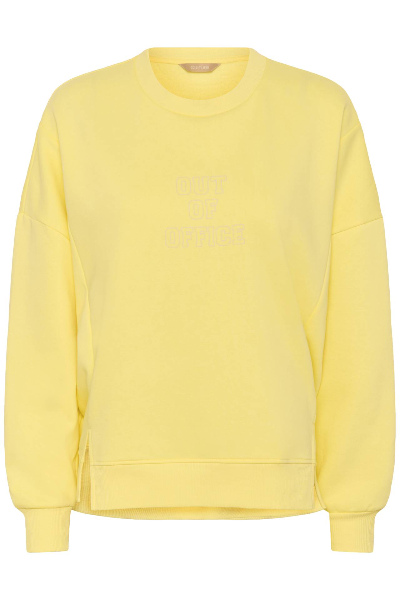 Cool og blød sweatshirt fra Culture i gul. Den har et mindre tryk på fronten samt et stort Culture tryk henover bagsiden af ærmer og ryg. Sweatshirten har ribkant i halsen, på ærmekant og nederst. Fed slids detalje i siden samt en børstet blød vrangside. Kvalitet: 65% Bomuld og 35% Polyester