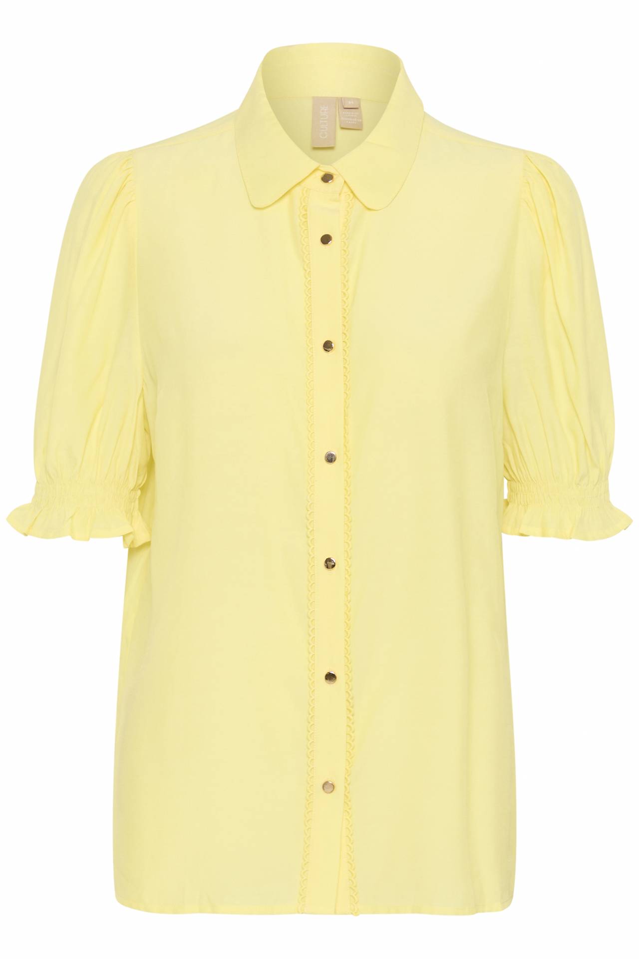 Super sød skjorte fra Culture i gul. Den har skjortekrave og er gennemknappet med guldknapper og flæser. Den har 3/4 ærmer med elastik. Den har en normal pasform og længde. Style den evt med en sød underdel dertil. Kvalitet: 65% Viscose, 35% Polyester Vask: 30 grader