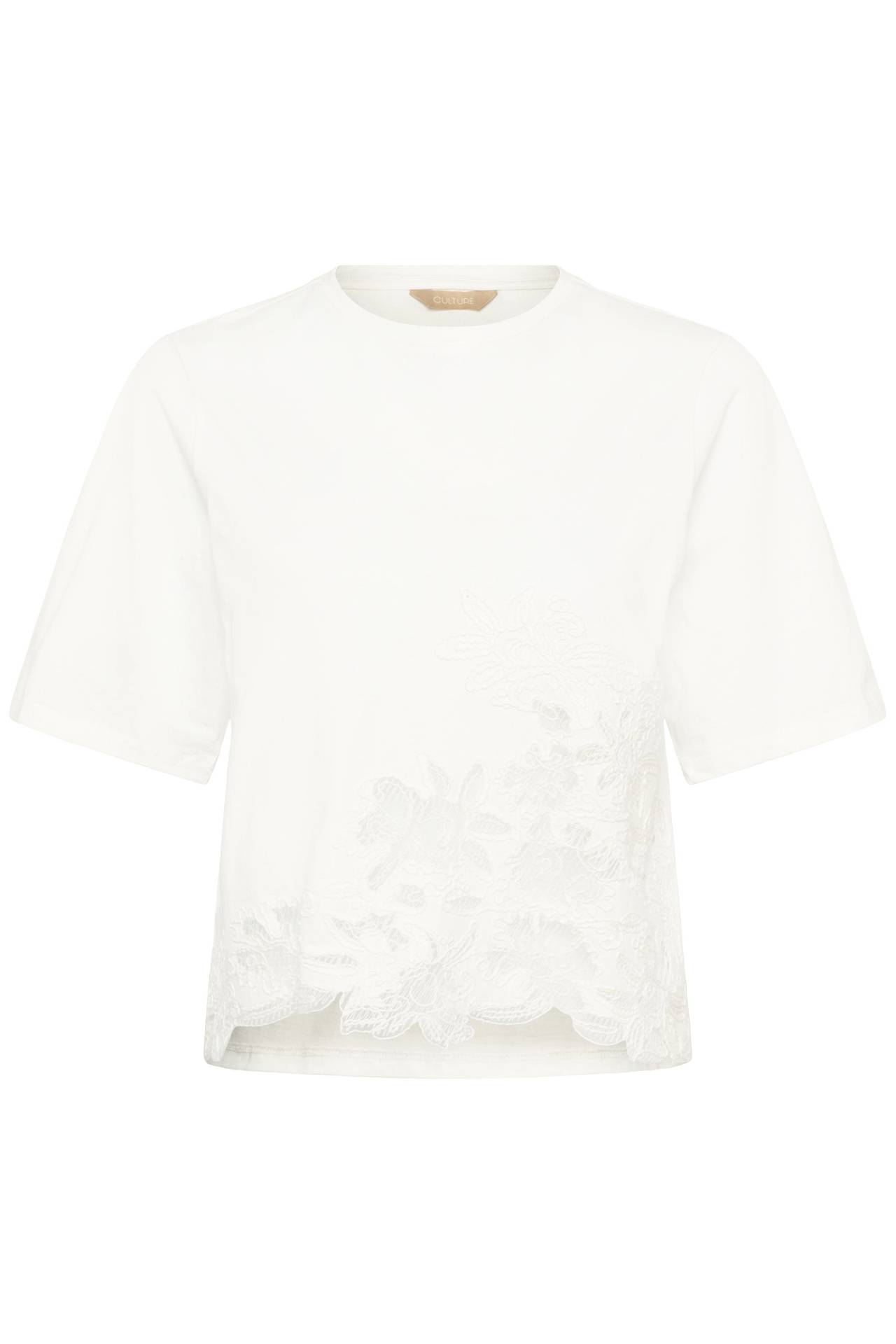 Super flot t-shirt i hvid med broderi i bunden. Den har rund hals med korte ærmer. Den har en normal pasform og længde. Styles med en sød underdel. Kvalitet: 100% cotton Care instructions: Machine wash on gentle cycle, machine wash at 30 °C, do not tumble dry, do not bleach