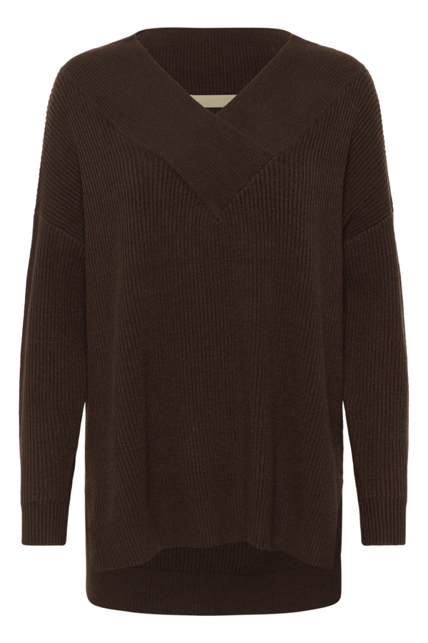 Lækker brun strik fra Culture. Har v-udskæirng og slids nederst i siden. Materiale: 55% viskose, 28% polyester og 17% polyamid. Vask: 30 grader.