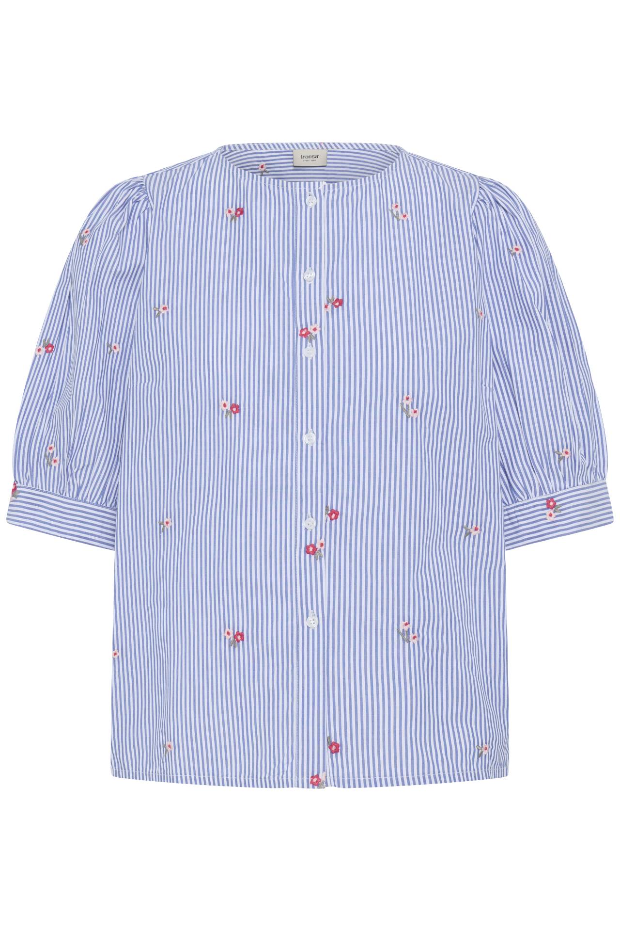 Super smuk skjorte fra Fransa i hvid og blå striber med blomsterprint. Den har rund hals og er gennemknappet med 3/4 ærmer. Den har en normal pasform og længde. Styles evt med en denim buks/nederdel. Kvalitet: 100% Cotton