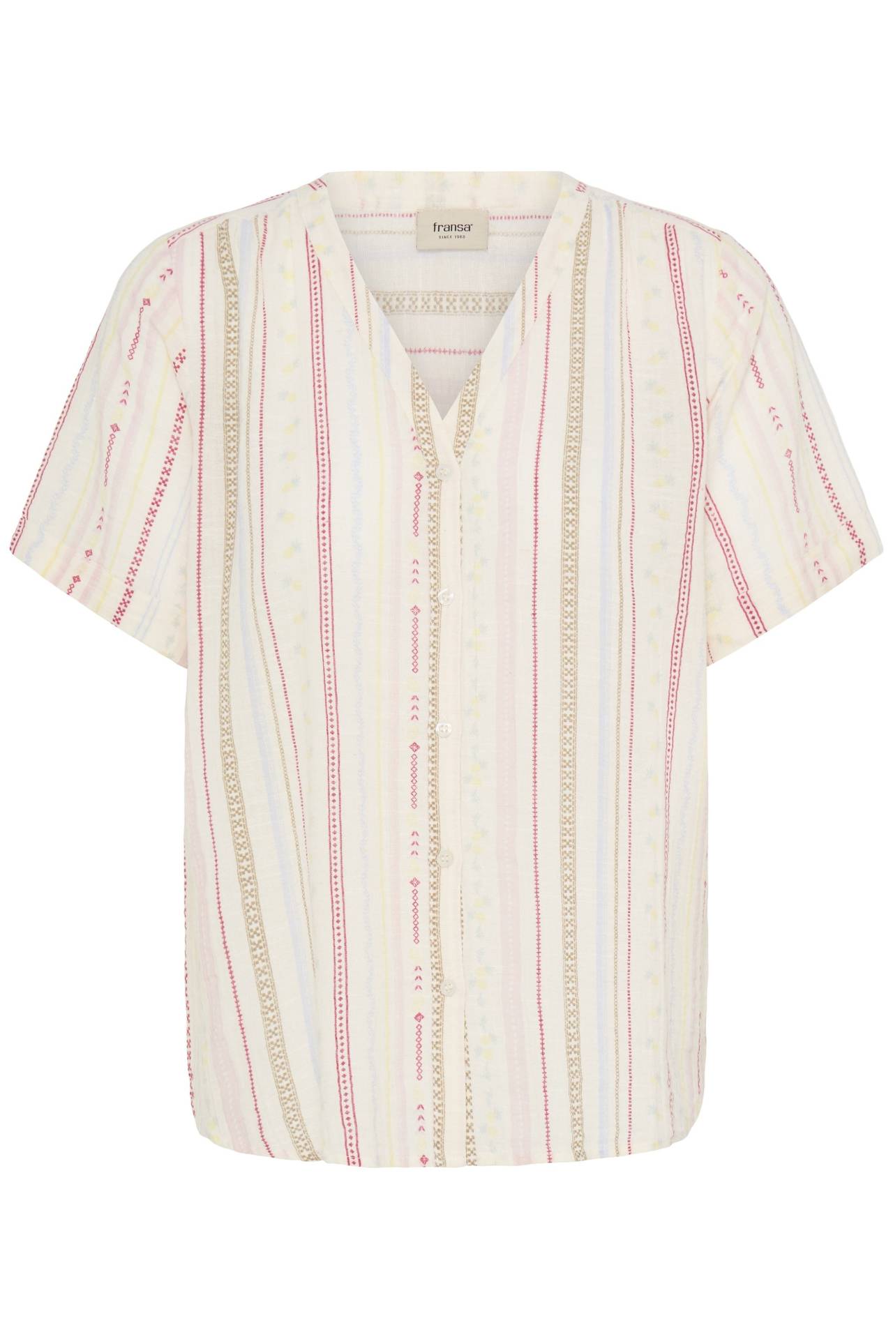 Super sød bluse fra Fransa i rød og gule nuancer. Den har v-udskæring og korte ærmer, samt er gennemknappet. Den har en normal pasform og længde. Bemærk de søde detaljer og farver i blusen. Styles evt med en sød denim underdel. Kvalitet: 90% Cotton, 10% Linen Vask: 30 grader