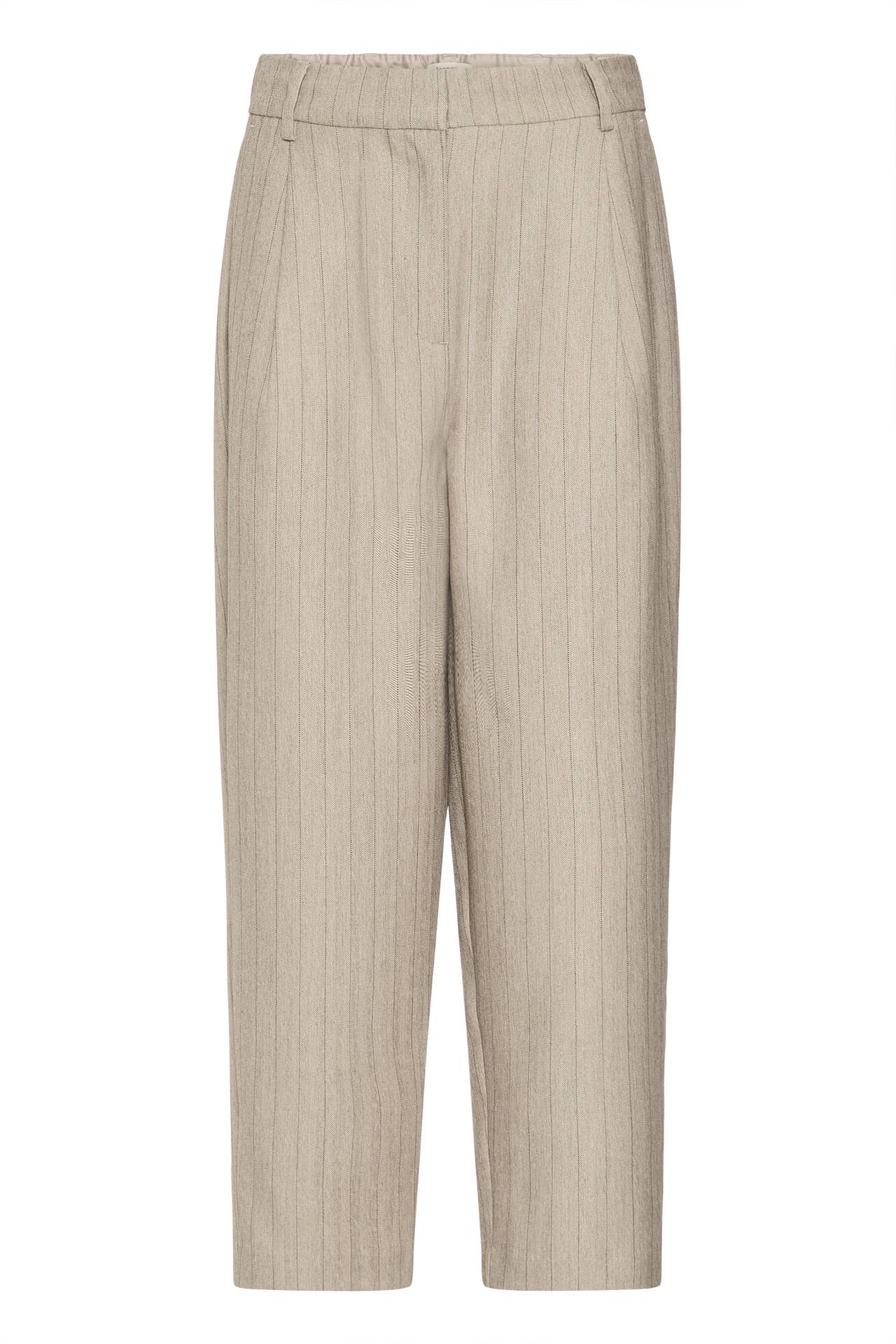Super flot og klassisk buks fra Fransa i lysebrun og sort stribe. Den har elastik i taljen med lynlås og knappefunktion. Den har lommer i siden og lige ben. Den har en løs pasform og ankellang. Style den med den matchende vest og top indenunder. Kvalitet: 86% Polyester, 10% Viscose, 4% Elastan