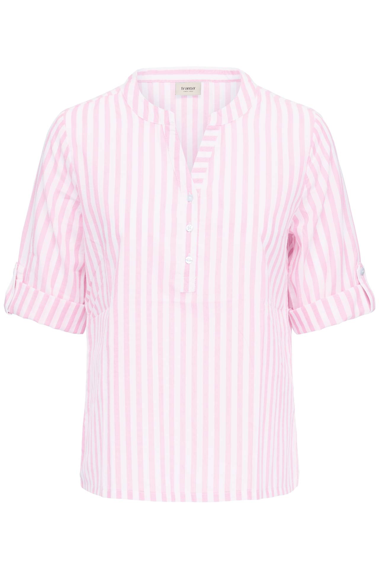 Super sød bluse fra Fransa i lyserøde og hvide striber. Den har kinakrave med v-udskæring og stolpelukning. Den er hoftelang og normal pasform. Style den evt med en denim underdel dertil. Kvalitet: 100% Cotton