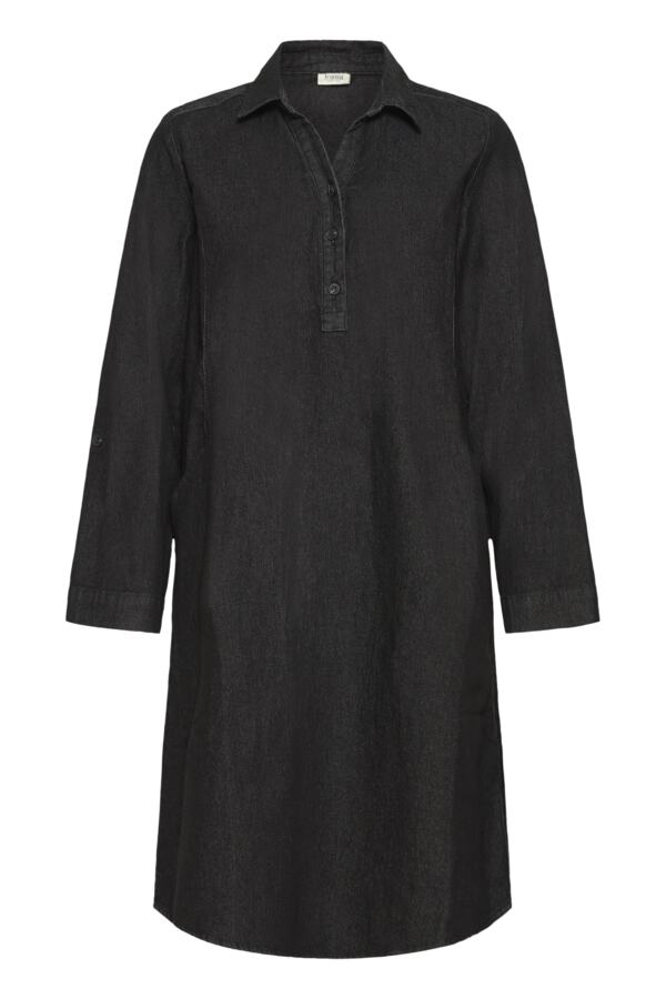 Lækker sort denimkjole fra Fransa. Har knapper øverst.og lommer i siden. Materiale: 80% bomuld, 18% polyester og 2% elastan. Vask: 30 grader.