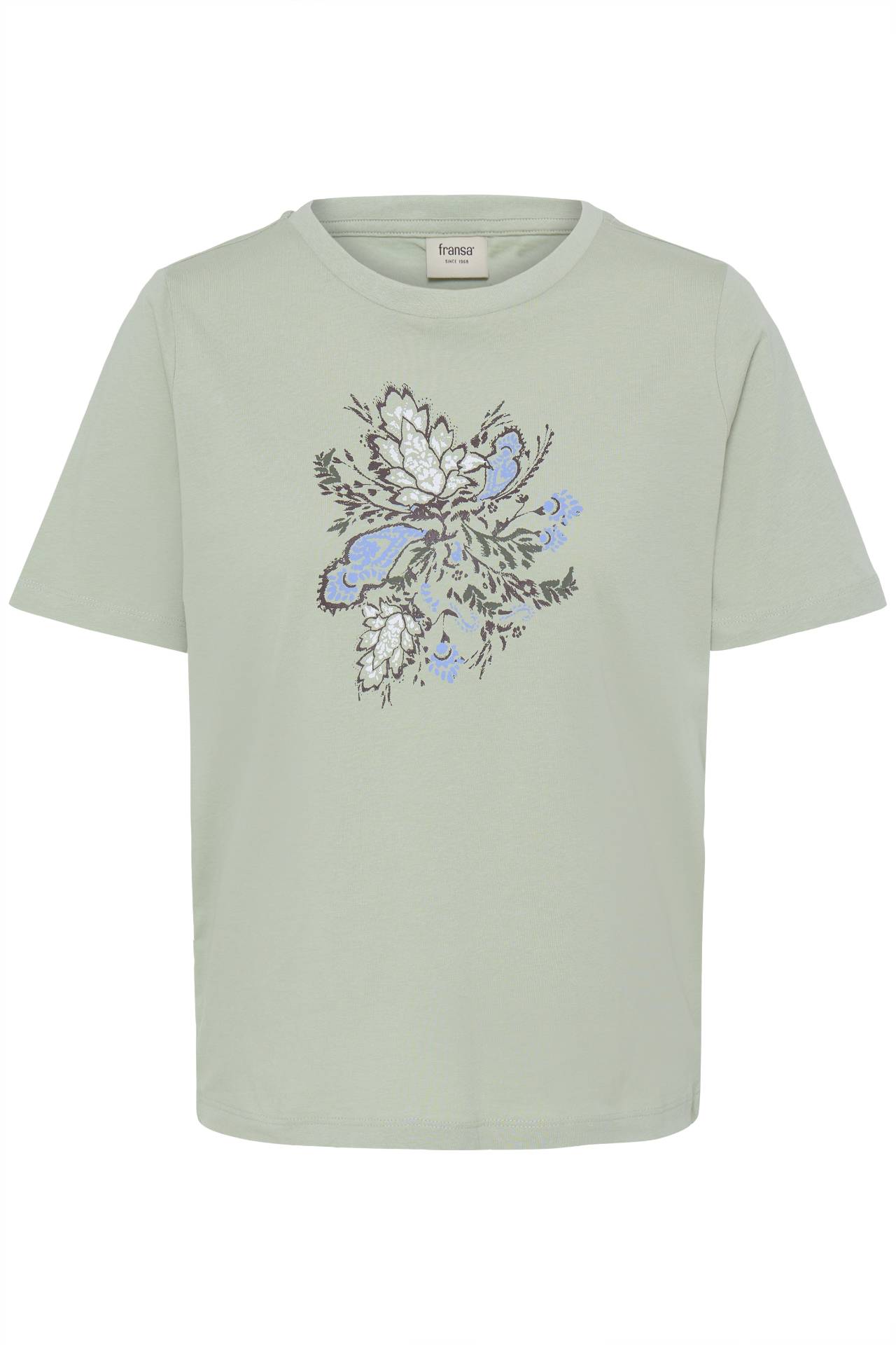 Super fin og simpel t-shirt fra Fransa i grønlig print. T-shirt med korte ærmer, lige pasform og rund hals. Blød overflade og botanisk printdetalje på brystet skaber diskret visuel effekt. Pasform: Regular fit Længde: Normal længde Ærmer: Kort ærme Kvalitet: Bomuld