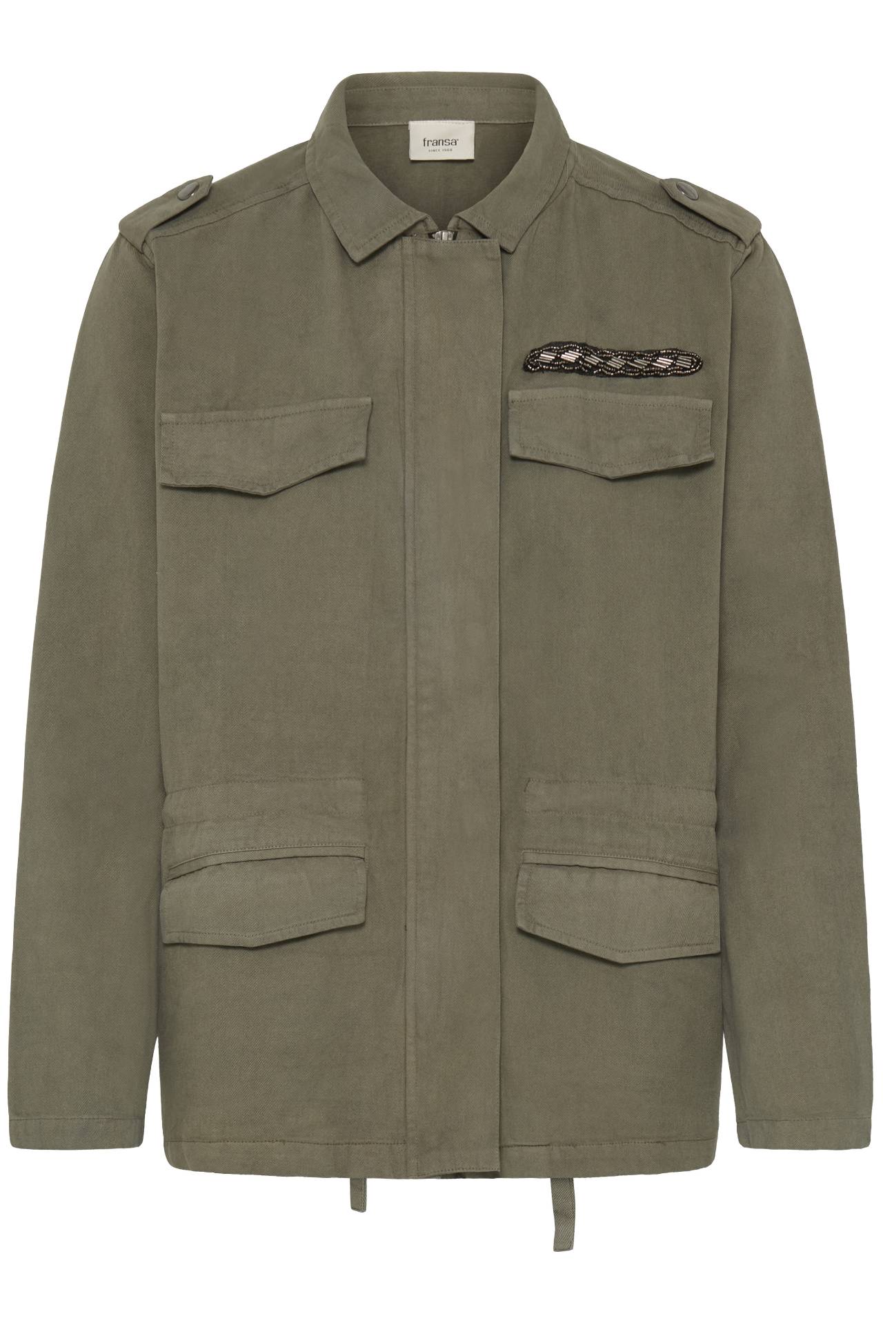 Super flot jakke fra Fransa i oliven grøn. Den har krave og er gennemknappet med skjulte knapper. Den har en normal længde og afslappet pasform med elastik i taljen. Bemærk det flotte print bagpå og detaljerne front. Styles med en flot top indenunder og fin underdel. Kvalitet: 100% cotton
