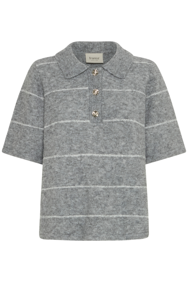 Lækker grå strikpolo med hvide striber fra Fransa. Materiale: 53% polyester, 39% akryl, 5% uld og 3% elastan. Vask: 30 grader.