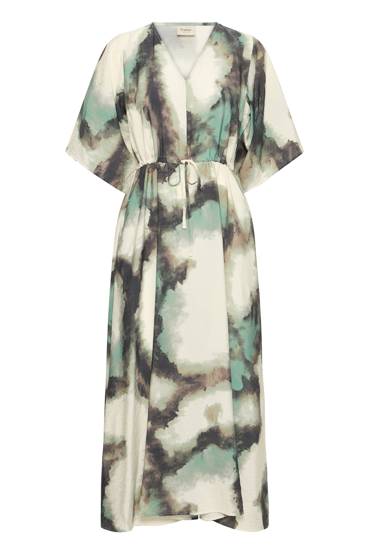 Super smuk kjole fra Fransa i grønlig marble print. Den har v-udskæring og korte ærmer. Det er en lang kjole der går lige over anklerne. Den har en normal pasform med bindebånd i taljen. Styles med en sød sandal. Kvalitet: 83% Viscose, 17% Nylon Vask: 30 g.