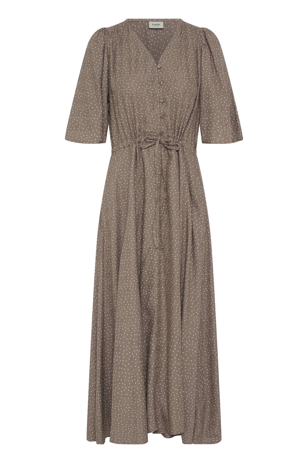 Super smuk og klassisk kjole fra Fransa i brun og hvide prikker. Den har v-udskæring og stolpelukning med ærmer til albuen. Det er en lang kjole med bindebånd i taljen. Den falder flot og man justere hvor stram den skal være. Styles evt med en hvid sneaker eller hæl. Kvalitet: 100% viskose