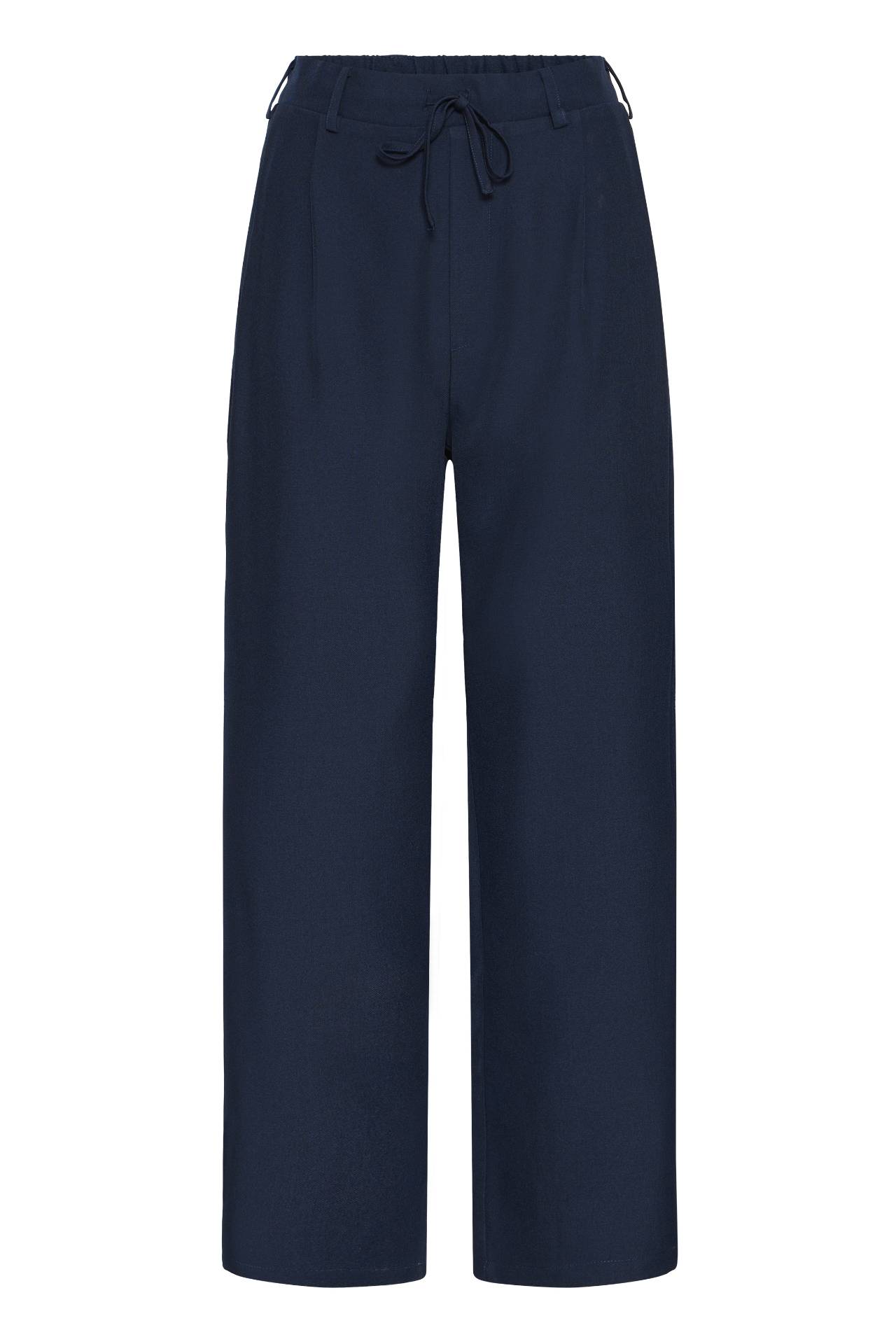 Marineblå bukser med lige ben fra Fransa. De er med elastik i taljen, lommer og snøredetalje i taljen. Style den med en skjorte eller bluse evt. Materiale: 95% polyester, 5% elastan