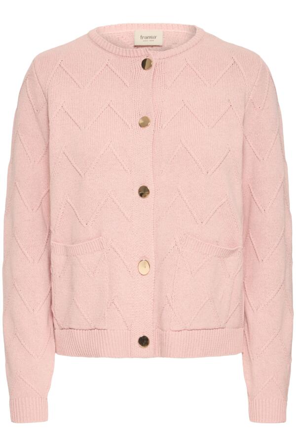 Smuk rosa cardigan med guldknapper fra Fransa. Cardiganen er cropped i modellen og har ribkant forneden. Materiale: 70% bomuld og 30% bomuld. Vask: 30 grader.