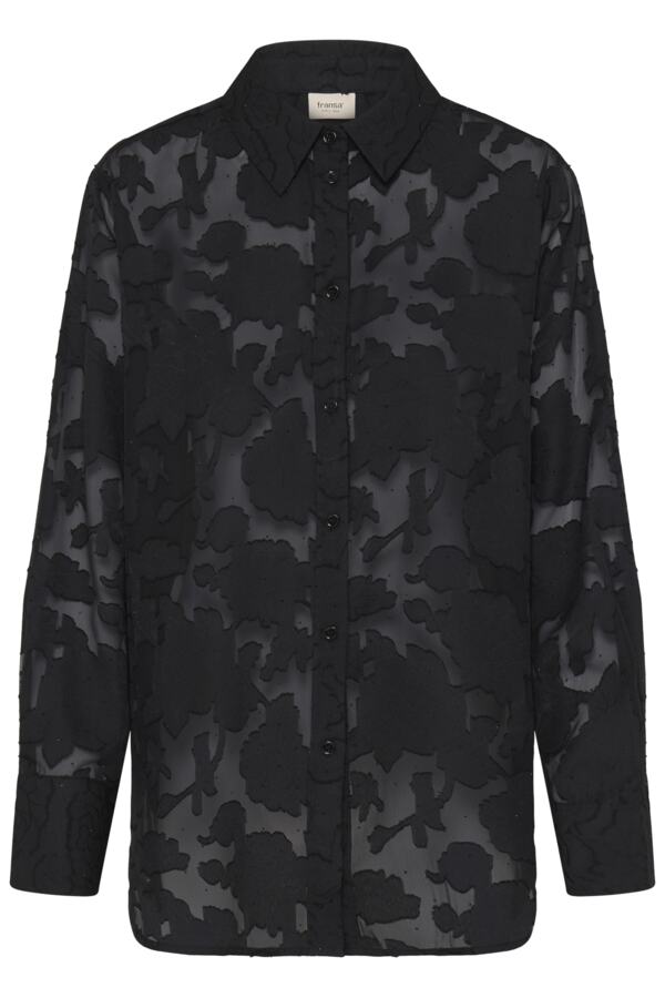 Lækker sort skjorte fra Fransa med rhinsten. Er gennemknappet. Materiale: 100% polyester. Vask: 30 grader.