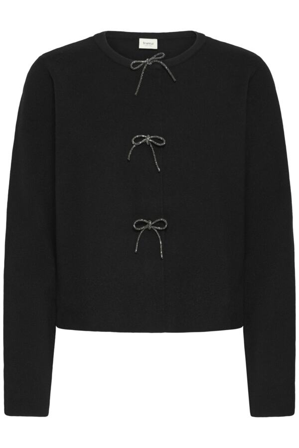 Festlig sort cardigan fra Fransa med sløjfer i glitter. Har rund hals og er kort i længden. Materiale: 40% viskose, 38% polyester og 22% nylon. Vask: 30 grader.