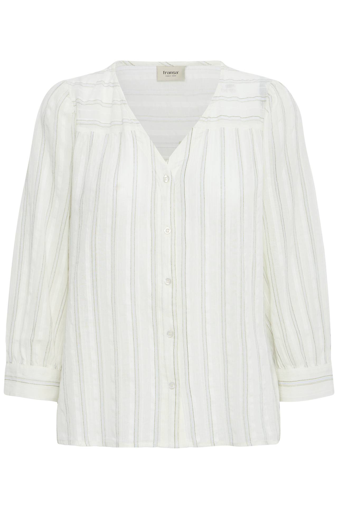Super fin skjorte fra Fransa i hvid, blå og grønne striber. Den har v-udskæring og lange ærmer, samt er gennemknappet. Den har en normal pasform og længde. Style den med en sød underdel. Kvalitet: 100% cotton