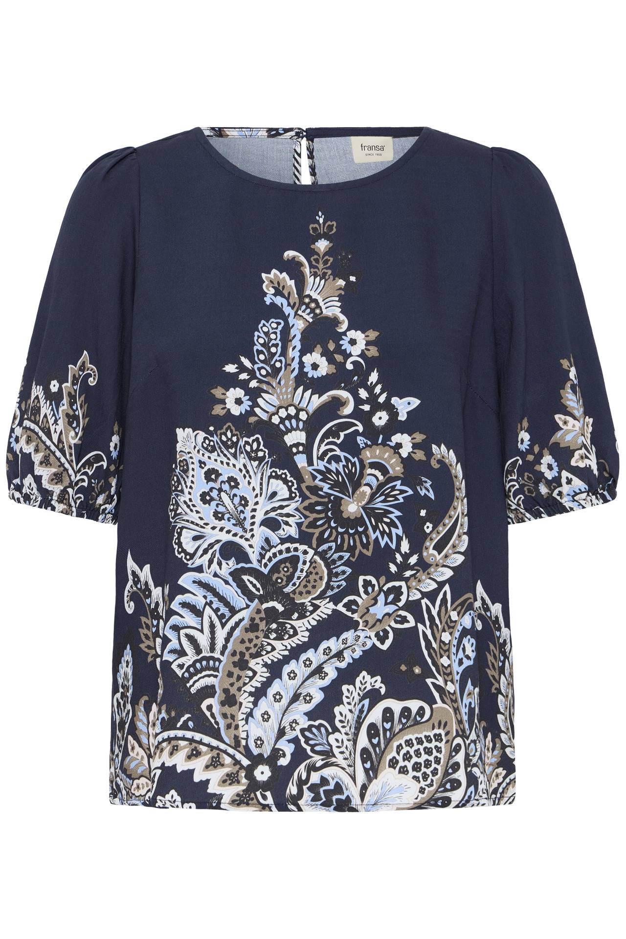 Super sød bluse fra Fransa i navy med print. Den har rund hals med korte ærmer. Normal størrelse, pasform og længde. Bemærk knapfunktion bagpå i nakken. Kvalitet: 85% Viscose, 15% Polyamide