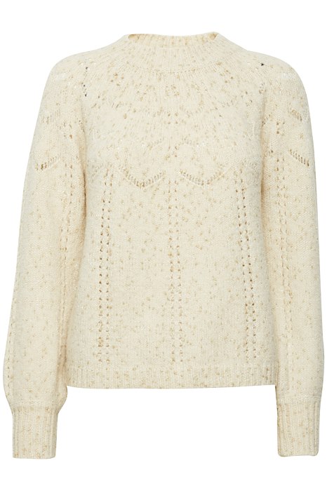 Super lækker og flot strik fra Fransa i off-white med guld tråd. Den har rund hals med lange ærmer. Den er normal i størrelsen med normal længde. Den har broderi detaljer og bemærk guld tråd i strikken. Style den evt med jeans eller nederdel. Kvalitet: 73% Nylon,19% Polyester,8% Metallic Yarn