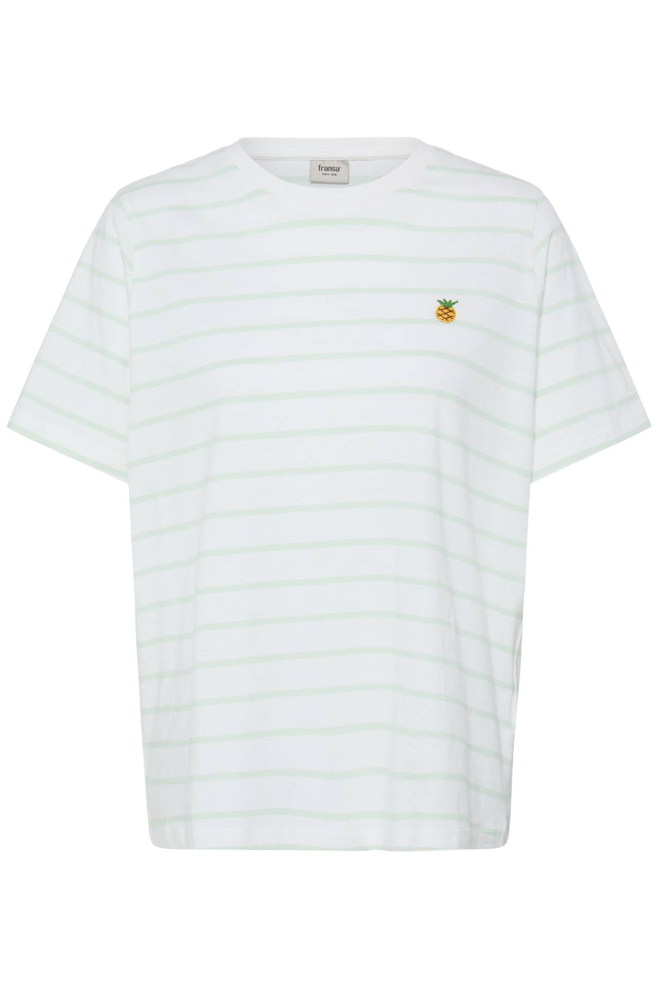 Super fin og enkel t-shirt fra Fransa i hvid og grønne striber med ananas på fronten. Den har rund hals og korte ærmer. Den har en normal pasform og længde. Styles med en sød underdel. Kvalitet: 100% Cotton