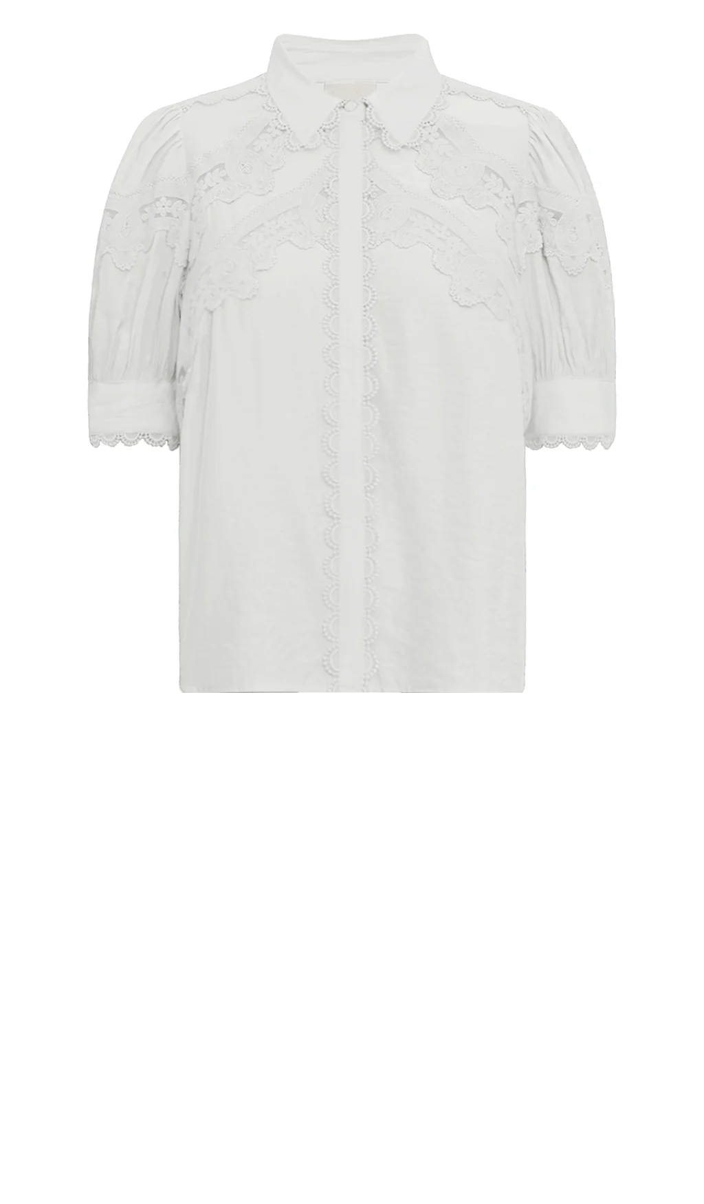 CornaGO Shirt let, elegant og feminin CornaGO Shirt er en let og elegant skjortebluse med korte pufærmer og mange fine blondedetaljer, der giver et feminint og sofistikeret udtryk. Den luftige kvalitet og de delikate detaljer gør blusen perfekt til både hverdag og mere festlige anledninger. Bryst: XS/100 cm, S/104 cm, M/108 cm, L/114 cm, XL/120 cm Længde: XS/61,5 cm, S/62,5 cm, M/63,5 cm, L/65 cm, XL/66,5 cm Kvalitet: 57% Polyamide 43% Viscose
