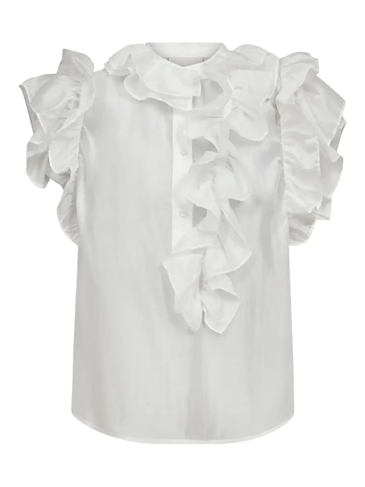 Feminin bluse i et let og luftigt stof, der føles behageligt hele dagen og giver et elegant udtryk. Den er perfekt til både forår og sommer og ideel til både hverdag og fest. Blusen er designet med smukke flæsedetaljer ved både ærmer og hals, som skaber et eksklusivt og feminint look, der løfter ethvert outfit. Foran har blusen en halv stolpelukning med knapper, så den kan åbnes en smule i halsen efter ønske. En alsidig favorit i garderoben, der nemt kan styles op med en nederdel eller elegante bukser til festlige anledninger - eller styles mere afslappet med jeans for et chic hverdagslook. En bluse, du vil vende tilbage til igen og igen. Bryst: XS/98 cm, S/102 cm, M/106 cm, L/112 cm, XL/118 cm Længde: XS/60 cm, S/61 cm, M/62 cm, L/63 cm, XL/64 cm Farve: Off-white Kvalitet: 90% Tencel 10% Polyester