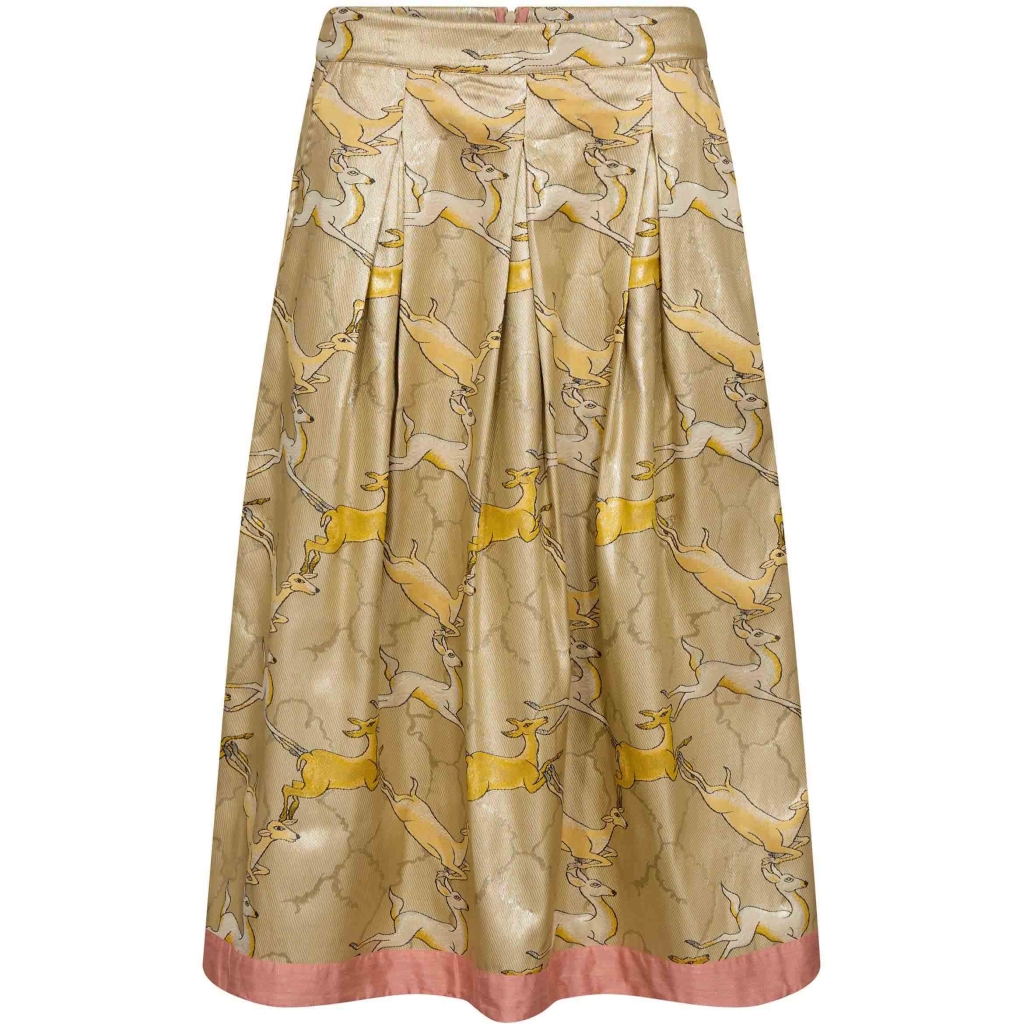 Smukkeste guld nederdel med lyserød bund fra Gossia. Det er en maxi skirt og lynlås bagpå. Bemærk det flotte dyreprint og shiny materiale. Styles evt med en lyserød top. Materiale: 90% Polyester Jacquard 10% Metalliske