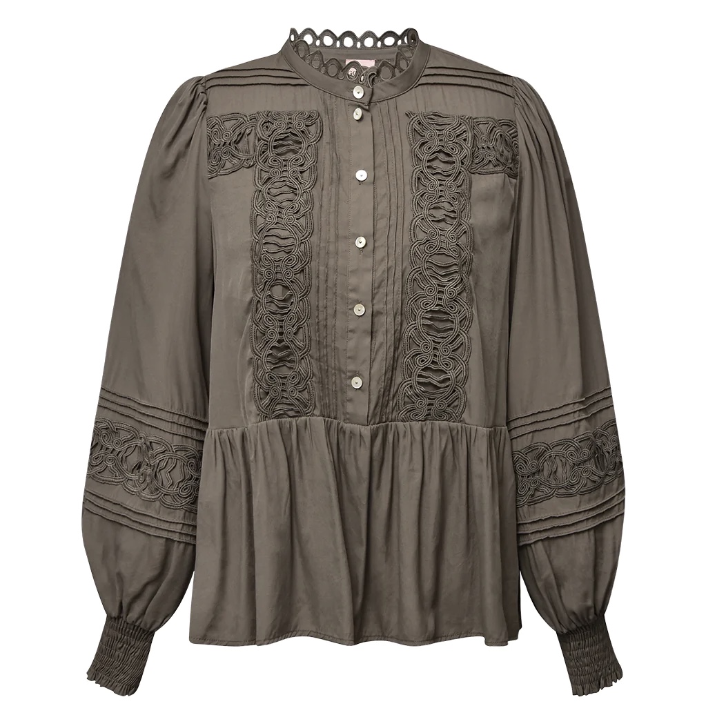 Skønneste top i blød og lækker viscose kvalitet, og med de smukkeste påsyede blonder. Toppen er med knapper, skæring i talje med rynk, vid ærme med smock i håndledet. Style toppen med nogle bukser og coo støvler. Kvalitet: 70% Viscose 30% Polyamide Bryst: XS/100 cm, S/104 cm, M/108 cm, L/114 cm, XL/120 cm Længde: XS/62 cm, S/63 cm, M/64 cm, L/65 cm, XL/66 cm
