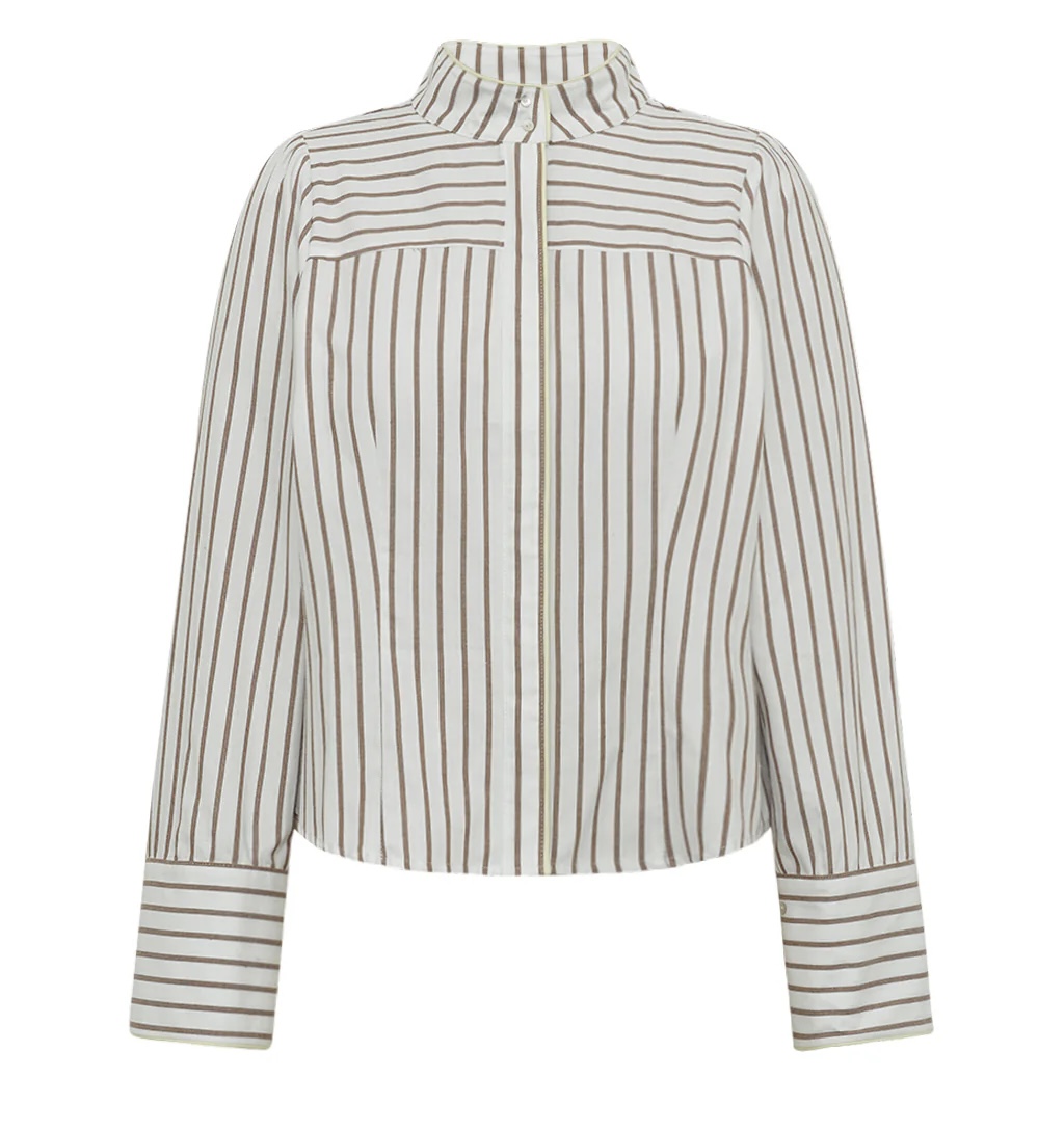 Stribet skjorte fra Gossia med off-white bundfarve og brune striber. Den har høj hals og lynlåslukning foran samt lange ærmer med manchetter. Høj hals med rullekrave Lynlåslukning foran Lange ærmer med manchetter Off-white med brune striber 76% Bomuld, 13% Viskose, 5% Polyester, 3% Modal, 3% Hør