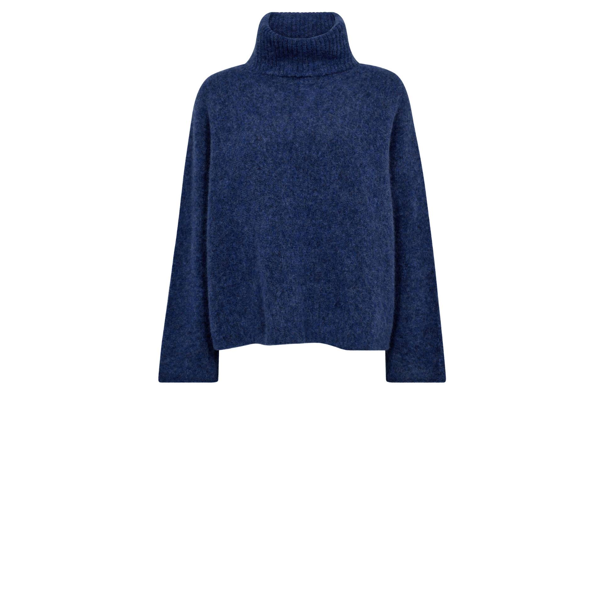 Lækker blå strik fra Gossia. Er dejlig tyk i materialet. Har turtleneck. Materiale: 48% alpaka, 28% polyamid, 21% uld og 3% elastan. Vask: 30 grader.